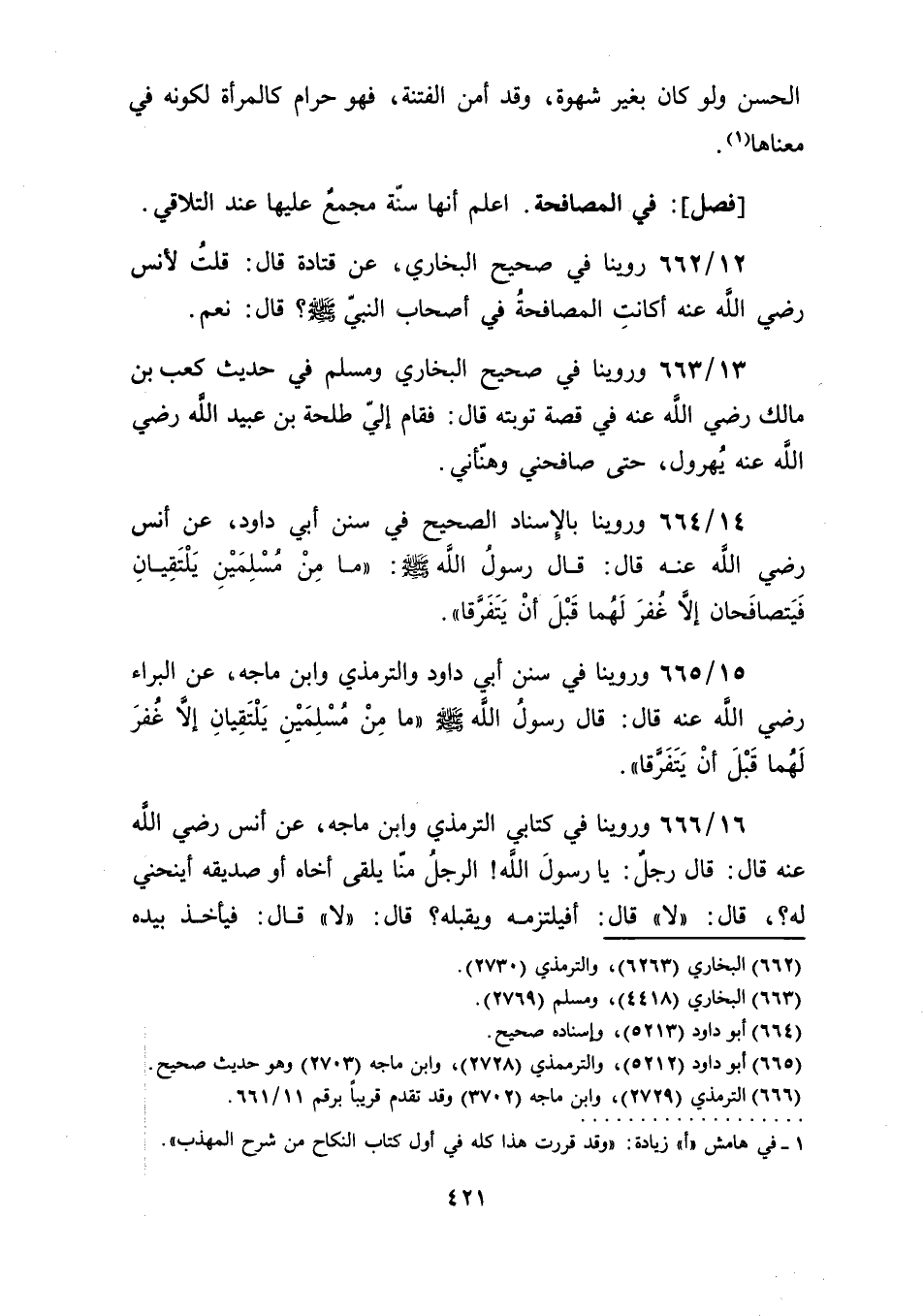 [فصل]: في المصافحة: اعلم أنها سنّة مجمعٌ عليها عند التلاقي.