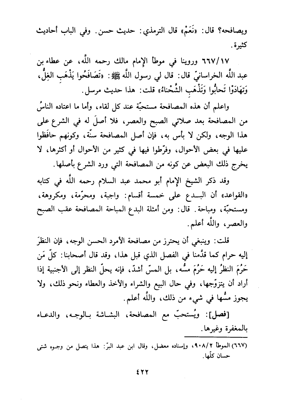 واعلم أن هذه المصافحة مستحبّة عند كل لقاء، وأما ما اعتاده الناسُ من المصافحة بعد صلاتي الصبح والعصر، فلا أصلَ له في الشرع على هذا الوجه، ولكن لا بأس به، فإن أصل المصافحة سنّة، وكونهم حافَظوا عليها في بعض الأحوال، وفرّطوا فيها في كثير من الأحوال أو أكثرها، لا يخرج ذلك البعض عن كونه من المصافحة التي ورد الشرع بأصلها.
