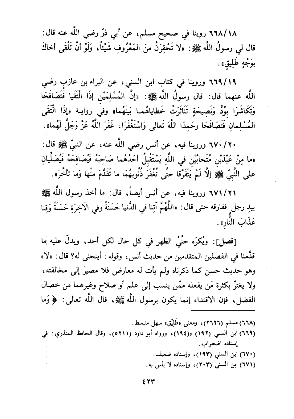 عن النبيّ صلى الله عليه وسلم قال: "مَا مِنْ عَبْدَيْنِ مُتَحابَّيْنِ في اللَّهِ يَسْتَقْبِلُ أحَدُهُما صَاحِبَهُ فَيُصَافِحَهُ فَيُصَلِّيانِ على النَّبِيّ صلى الله عليه وسلم إِلاَّ لَمْ يَتَفَرَّقَا حتَّى تُغْفَرَ ذُنُوبهُمَا ما تَقَدَّمَ منْها وَما تَأخَّرَ".