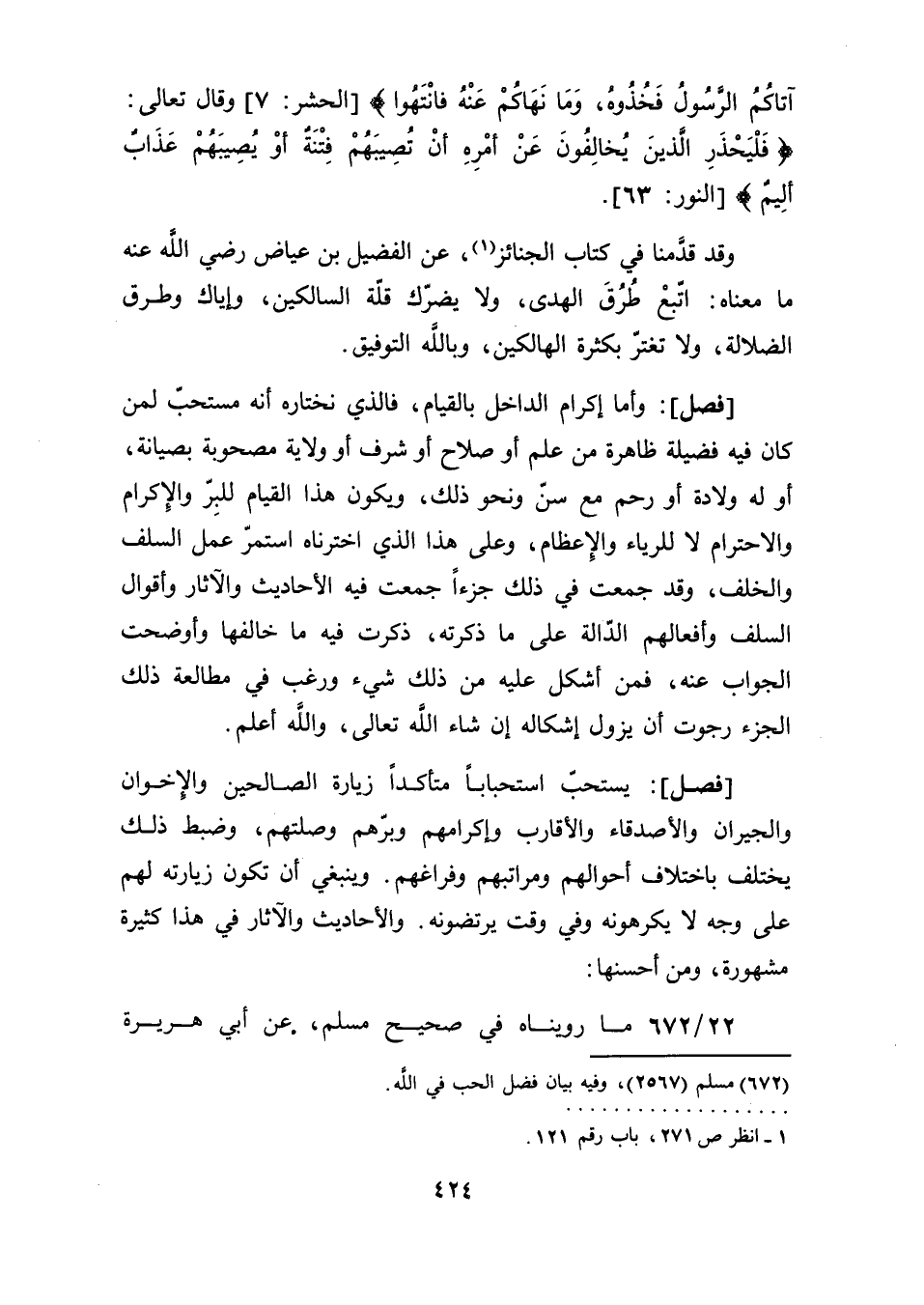 [فصل]: يستحبّ استحبابًا متأكدًا زيارة الصالحين والإِخوان والجيران والأصدقاء والأقارب وإكرامهم وبرّهم وصلتهم، وضبط ذلك يختلف باختلاف أحواله ومراتبهم وفراغهم. وينبغي أن تكون زيارته لهم على وجه لا يكرهونه وفي وقت يرتضونه. والأحاديث والآثار في هذا كثيرة مشهورة، ومن أحسنها:
