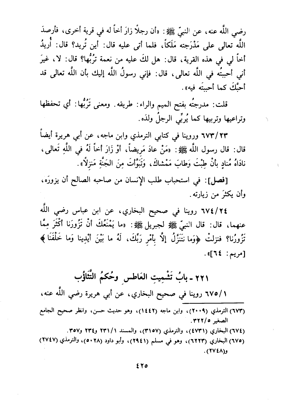 عن النبيّ صلى الله عليه وسلم: "أن رجلًا زارَ أخًا له في قرية أخرى، فأرصدَ الله تعالى على مَدْرَجته مَلَكًا، فلما أتى عليه قال: أين تُريد؟ قال: أُريدُ أخًا لي في هذه القرية، قال: هل لكَ عليه من نعمة ترُبُّها؟ قال: لا، غيرَ أني أحببتُه في الله تعالى، قال: فإني رسولُ الله إليك بأن الله تعالى قد أحبَّكَ كما أحببتَه فيه".