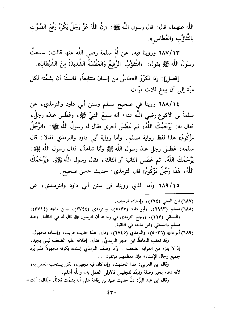 وقال ابن عبد البرّ: دلّ حديث عبيد بن رفاعة على أنه يشمّت ثلاثًا. ويُقال: أنت =