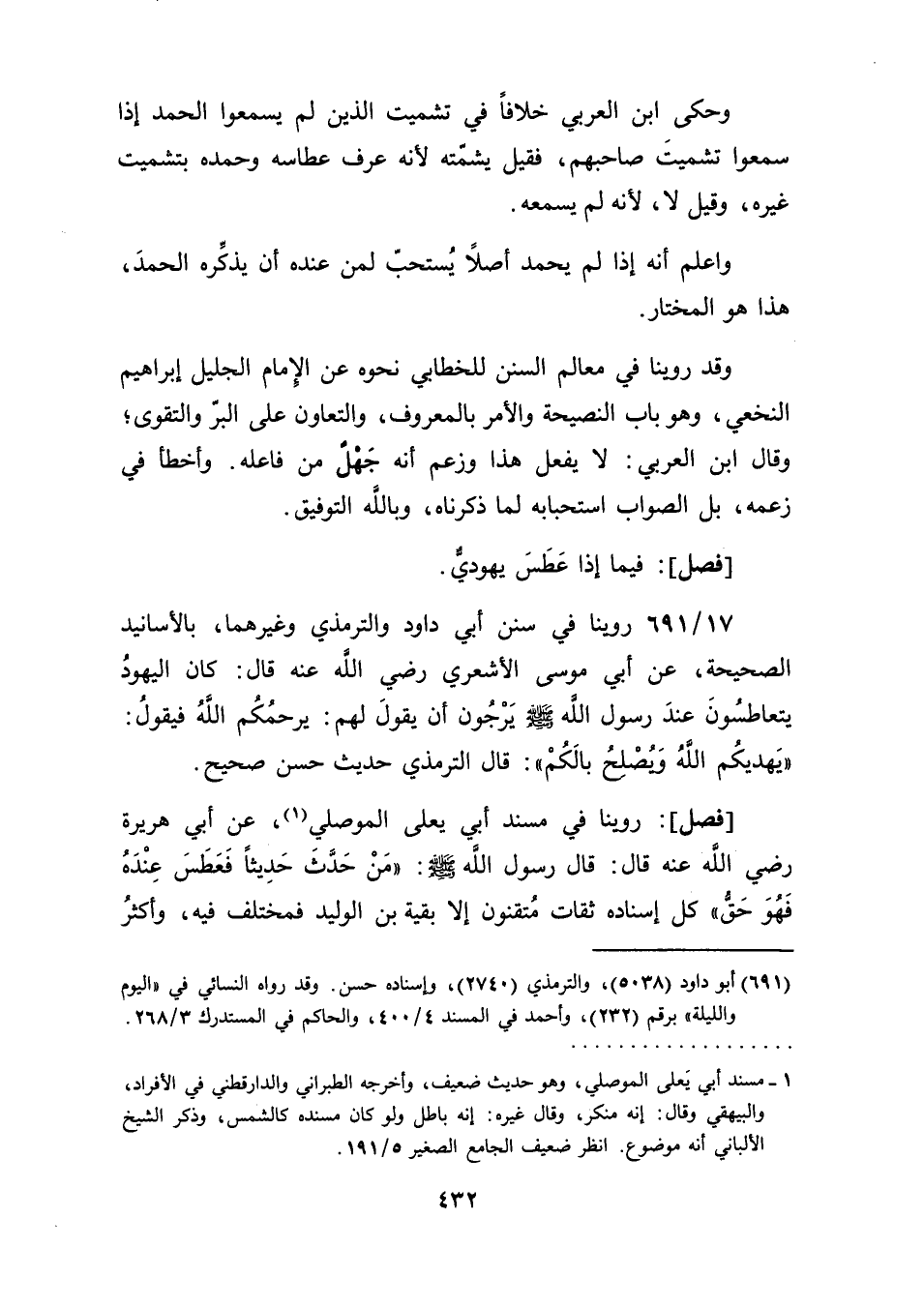 عن أبي موسى الأشعري رضي الله عنه قال: كان اليهودُ يتعاطسُونَ عندَ رسول الله صلى الله عليه وسلم يَرْجُون أن يقولَ لهم: يرحمُكُم اللَّهُ فيقولُ: "يَهديكُم اللَّهُ وَيُصْلِحُ بالَكُمْ": قال الترمذي: حديث حسن صحيح.