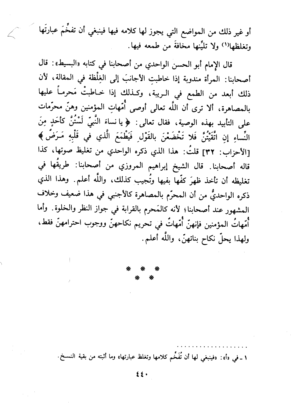 قال الإِمام أبو الحسن الواحدي من أصحابنا في كتابه "البسيط": قال أصحابنا: المرأة مندوبة إذا خاطبتِ الأجانبَ إلى الغِلْظة في المقالة، لأن ذلك أبعد من الطمع في الريبة، وكذلك إذا خاطبتْ مَحرمًا عليها بالمصاهرة، ألا ترى أن الله تعالى أوصى أُمّهات المؤمنين وهنّ محرّمات على التأبيد بهذه الوصية، فقال تعالى: {يا نساءَ النَّبيّ لَسْتُنَّ كَأحَدٍ مِنَ النِّساءِ إِنِ اتَّقَيْتُنَّ فَلا تَخْضَعْنَ بالقَوْلِ فَيَطْمَعَ الَّذي في قَلْبِهِ مَرَضٌ} [الأحزاب:32] قلتُ: هذا الذي ذكره الواحدي من تغليظ صوتها، كذا قاله أصحابنا. قال الشيخ إبراهيم المروزي من أصحابنا: طريقُها في تغليظه أن تأخذ ظهرَ كفّها بفيها وتُجيب كذلك، والله أعلم. وهذا الذي ذكره الواحديُّ من أن المحرّم بالمصاهرة كالأجنبي في هذا ضعيف وخلاف المشهور عند أصحابنا؛ لأنه كالمَحرم بالقرابة في جواز النظر والخلوة. وأما أُمَّهاتُ المؤمنين فإنهنّ أُمّهاتٌ في تحريم نكاحهنّ ووجوب احترامهنّ فقط، ولهذا يحلّ نكاح بناتهنّ، والله أعلم.