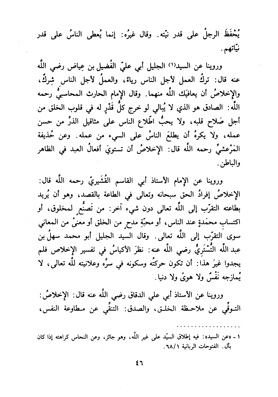 وروينا عن الإمام الأستاذ أبي القاسم القُشَيريّ رحمه الله قال: الإِخلاصُ إفرادُ الحق سبحانه وتعالى في الطاعة بالقصد، وهو أن يُريد بطاعته التقرّب إلى الله تعالى دون شيء آخر: من تَصنعٍ لمخلوق، أو اكتساب محمَدةٍ عند الناس، أو محبّة مدحٍ من الخلق أو معنى من المعاني سوى التقرّب إلى الله تعالى. وقال السيد الجليل أبو محمد سهل بن عبد الله التُستَريُّ رضي الله عنه: نظر الأكياسُ في تفسير الإِخلاص فلم يجدوا غير هذا: أن يكون حركتُه وسكونه في سرِّه وعلانيته لله تعالى، ولا يُمازجه نَفسٌ ولا هوىً ولا دنيا.
