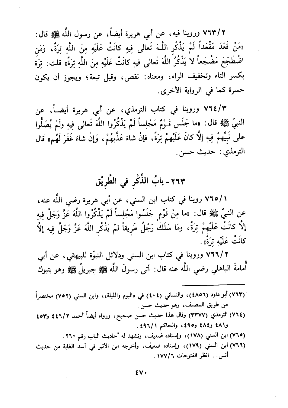 [3/ 764] وروينا في كتاب الترمذي، عن أبي هريرة أيضًا، عن النبيّ صلى الله عليه وسلم قال: "ما جَلَس قَوْمٌ مَجْلِسًا لَمْ يَذْكُرُوا اللَّهَ تَعالى فِيهِ ولَمْ يُصَلُّوا على نَبِيِّهمْ فِيهِ إِلاَّ كانَ عَلَيْهِمْ تِرَةٌ، فإنْ شاءَ عَذبهُمْ، وَإنْ شاءَ غَفَرَ لَهُم" قال الترمذي: حديث حسن.