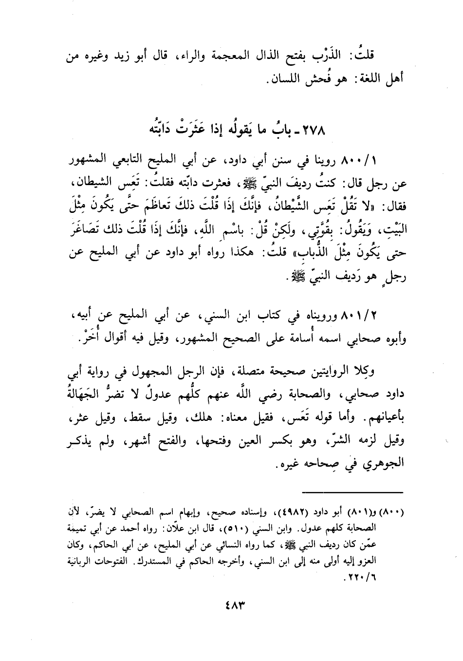 [800] و [801] أبو داود (4982)، وإسناده صحيح، وإبهام اسم الصحابي لا يضرّ، لأن الصحابة كلهم عدول. وابن السني (510)، قال ابن علاّن: رواه أحمد عن أبي تميمة عمّن كان رديف النبي صلى الله عليه وسلم، كما رواه النسائي عن أبي المليح، عن أبي الحاكم، وكان العزو إليه أولى منه إلى ابن السني، وأخرجه الحاكم في المستدرك. الفتوحات الربانية 6/ 220.