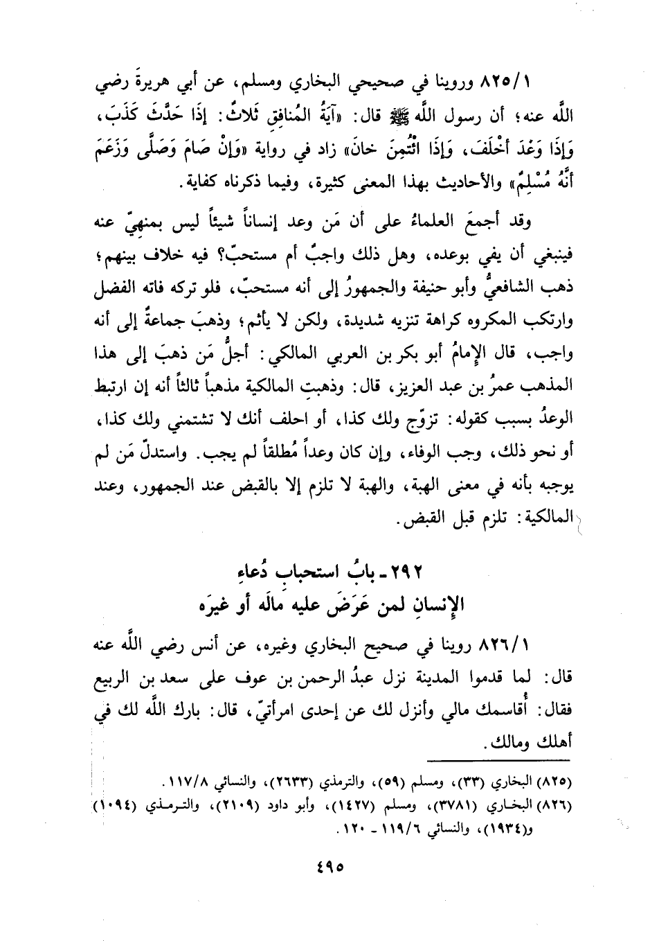 وقد أجمعَ العلماءُ على أن مَن وعد إنسانًا شيئًا ليس بمنهيّ عنه فينبغي أن يفي بوعده، وهل ذلك واجبٌ أو مستحبّ؟ فيه خلاف بينهم؛ ذهب الشافعيُّ وأبو حنيفة والجمهورُ إلى أنه مستحبّ، فلو تركه فاته الفضل وارتكب المكروه كراهة تنزيه شديدة، ولكن لا يأثم؛ وذهبَ جماعةٌ إلى أنه واجب، قال الإِمامُ أبو بكر بن العربي المالكي: أجلُّ مَن ذهبَ إلى هذا المذهب عمرُ بن عبد العزيز، قال: وذهبتِ المالكية مذهبًا ثالثًا أنه إن ارتبط الوعدُ بسبب كقوله: تزوّج ولك كذا، أو احلف أنك لا تشتمني ولك كذا، أو نحو ذلك، وجب الوفاء، وإن كان وعدًا مُطلقًا لم يجب. واستدلّ مَن لم يوجبه بأنه في معنى الهبة، والهبة لا تلزم إلا بالقبض عند الجمهور، وعند المالكية: تلزم قبل القبض.