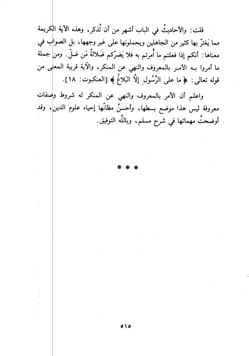 واعلم أن الأمر بالمعروف والنهي عن المنكر له شروط وصفات معروفة ليس هذا موضع بسطها، وأحسنُ مظانّها إحياء علوم الدين، وقد أوضحتُ مهماتها في شرح مسلم، وبالله التوفيق.