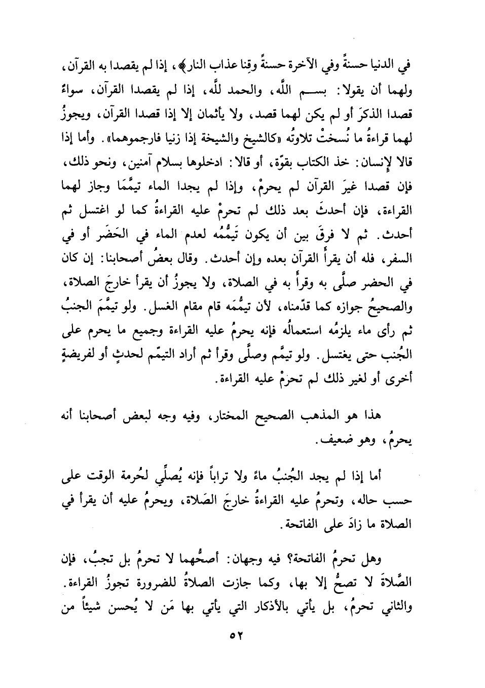 في الدنيا حسنةً وفي الآخرة حسنةً وقنا عذاب النار}، إذا لم يقصدا به القرآن، ولهما أن يقولا: بسم الله، والحمد لله، إذا لم يقصدا القرآن، سواءٌ قصدا الذكر أو لم يكن لهما قصد، ولا يأثمان إلا إذا قصدا القرآن، ويجوزُ لهما قراءةُ ما نُسخت تلاوتُه "كالشيخ والشيخة إذا زنيا فارجموهما". وأما إذا قالا لإِنسان: خذ الكتاب بقوّة، أو قالا: ادخلوها بسلام آمنين، ونحو ذلك، فإن قصدا غيرَ القرآن لم يحرم، وإذا لم يجدا الماء تيمَّمَا وجاز لهما القراءة، فإن أحدثَ بعد ذلك لم تحرم عليه القراءة كما لو اغتسل ثم أحدث. ثم لا فرق بين أن يكون تَيمُّمُه لعدم الماء في الحَضَر أو في السفر، فله أن يقرأ القرآن بعده وإن أحدث. وقال بعضُ أصحابنا: إن كان في الحضر صلَّى به وقرأ به في الصلاة، ولا يجوزُ أن يقرأ خارجَ الصلاة، والصحيحُ جوازه كما قدّمناه، لأن تيمُّمَه قام مقام الغسل. ولو تيمَّمَ الجنبُ ثم رأى ماء يلزمُه استعمالُه فإنه يحرمُ عليه القراءة وجميع ما يحرم على الجُنب حتى يغتسل.