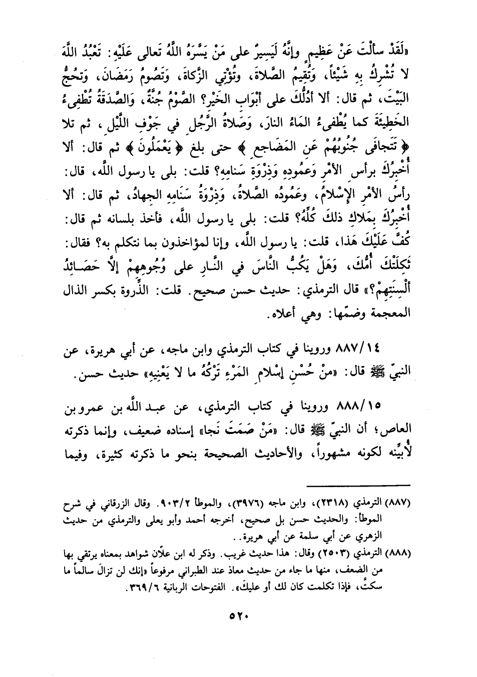 لَقَدْ سألْتَ عَنْ عَظِيمٍ وإنَّهُ لَيَسِيرٌ على مَنْ يَسَّرَهُ اللَّهُ تَعالى عَلَيْهِ: تَعْبُدُ اللَّهَ لاَ تُشْرِكُ بِهِ شَيْئًا، وَتُقِيمُ الصَّلاةَ، وتُؤْتِي الزَّكاةَ، وَتَصُومُ رَمَضَانَ، وَتَحُجُّ البَيْتَ، ثم قال: ألا أدُلُّكَ على أبْوَابِ الخَيْرِ؟ الصَّوْمُ جُنَّةٌ، وَالصَّدَقَةُ تُطْفِىءُ الخَطِيئَةَ كما يُطْفىءُ المَاءُ النارَ، وَصَلاةُ الرَّجُلِ في جَوْفِ اللَّيْلِ، ثم تلا {تَتَجافَى جُنُوبُهُمْ عَنِ المَضَاجعِ} حتى بلغ {يَعْمَلُونَ} ثم قال: ألا أُخْبِرُكَ برأسِ الأمْرِ وَعمُودِهِ وَذِرْوَةِ سَنامِهِ؟ قلت: بلى يا رسول الله! قال: رأسُ الأمْرِ الإِسْلامُ، وَعَمُودُهُ الصَّلاةُ، وَذِرْوَةُ سَنَامِهِ الجِهادُ، ثم قال: ألا أُخْبِرُكَ بِمَلاكِ ذلكَ كُلِّهُ؟ قلت: بلى يا رسول الله! فأخذ بلسانه ثم قال: كُفَّ عَلَيْكَ هَذَا، قلت: يا رسول الله! وإنا لمؤاخذون بما نتكلم به؟ فقال: ثَكِلَتْكَ أُمُّكَ، وَهَلْ يَكُبُّ النَّاسَ في النَّارِ على وُجُوهِهِمْ إِلاَّ حَصَائِدُ ألْسِنَتِهِمْ؟ " قال الترمذي: حديث حسن صحيح. قلت: الذِّروة بكسر الذال المعجمة وضمّها: وهي أعلاه.