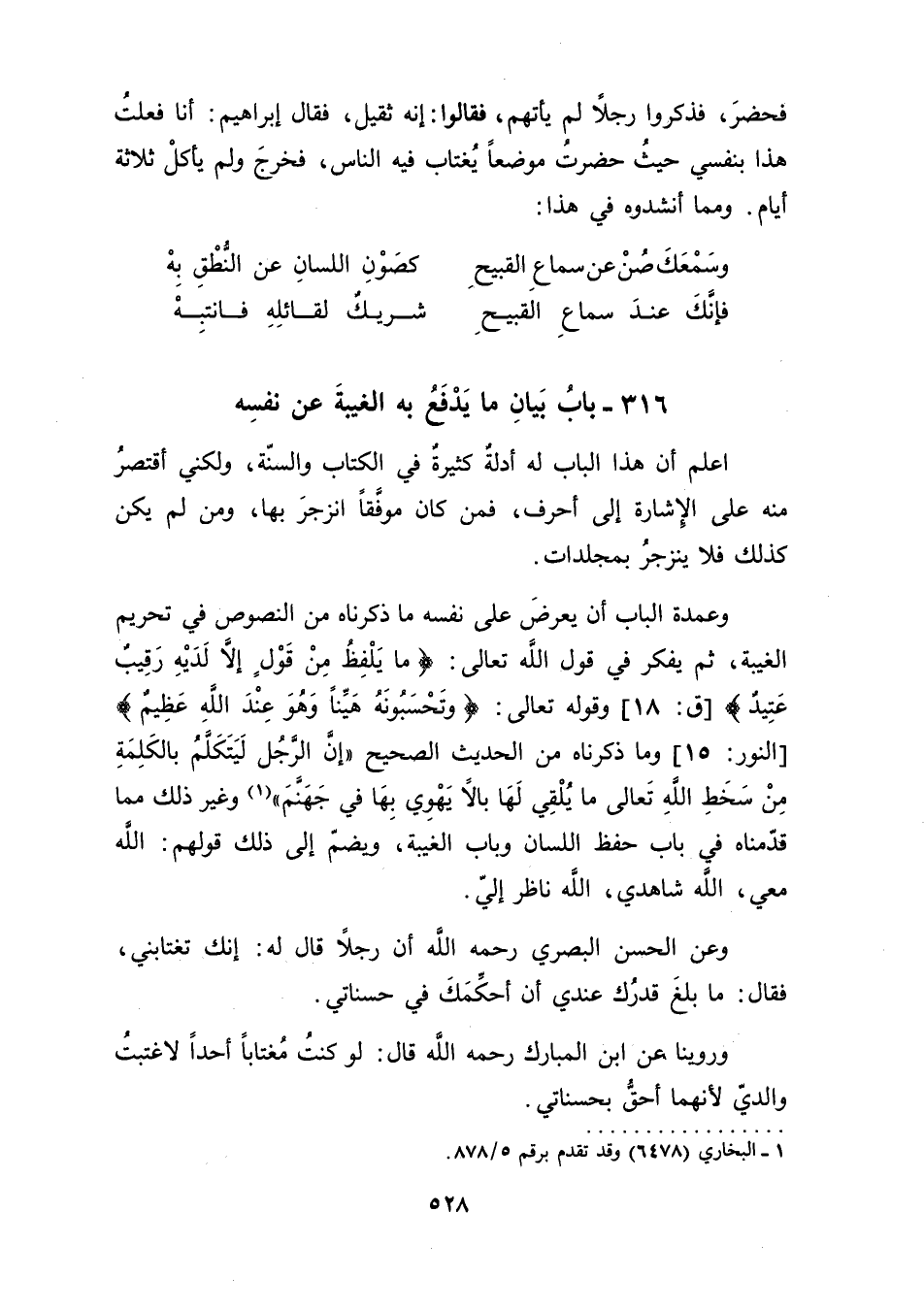 316 ـ بابُ بَيانِ ما يَدْفَعُ به الغيبةَ عن نفسِه