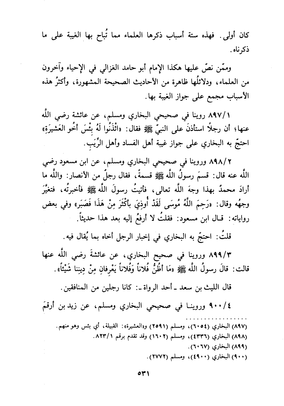 وممّن نصّ عليها هكذا الإِمام أبو حامد الغزالي في الإِحياء وآخرون من العلماء، ودلائلُها ظاهرة من الأحاديث الصحيحة المشهورة، وأكثرُ هذه الأسباب مجمع على جواز الغيبة بها.