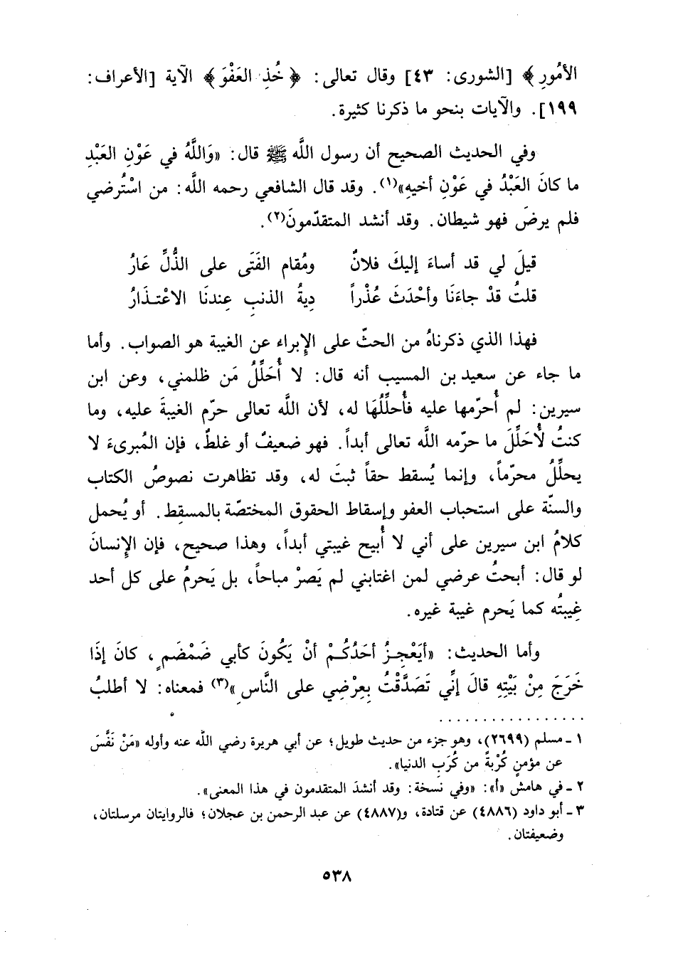 فهذا الذي ذكرناهُ من الحثَ على الإِبراء عن الغيبة هو الصواب. وأما ما جاء عن سعيد بن المسيب أنه قال: لا أُحَلِّلُ مَن ظلمني، وعن ابن سيرين: لم أُحرّمها عليه فأُحلِّلُهَا له، لأن الله تعالى حرّم الغيبةَ عليه، وما كنتُ لأُحَلِّلَ ما حرّمه الله تعالى أبدًا. فهو ضعيفٌ أو غلطٌ، فإن المُبرىءَ لا يحلِّلُ محرّمًا، وإنما يُسقط حقًا ثبتَ له، وقد تظاهرت نصوصُ الكتاب والسنّة على استحباب العفو وإسقاط الحقوق المختصّة بالمسقِط. أو يُحمل كلامُ ابن سيرين على أني لا أُبيح غيبتي أبدًا، وهذا صحيح، فإن الإِنسانَ لو قال: أبحتُ عرضي لمن اغتابني لم يَصرْ مباحًا، بل يَحرمُ على كل أحد غِيبتُه كما يَحرم غيبة غيره.