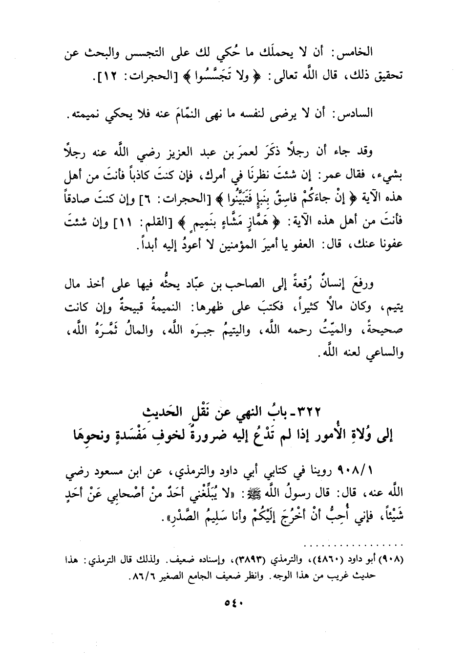 322 ـ بابُ النهي عن نَقْلِ الحَديثِ إلى وُلاةِ الأُمور إذا لم تَدْعُ إليه ضرورةٌ لخوفِ مَفْسدةٍ ونحوِهَا