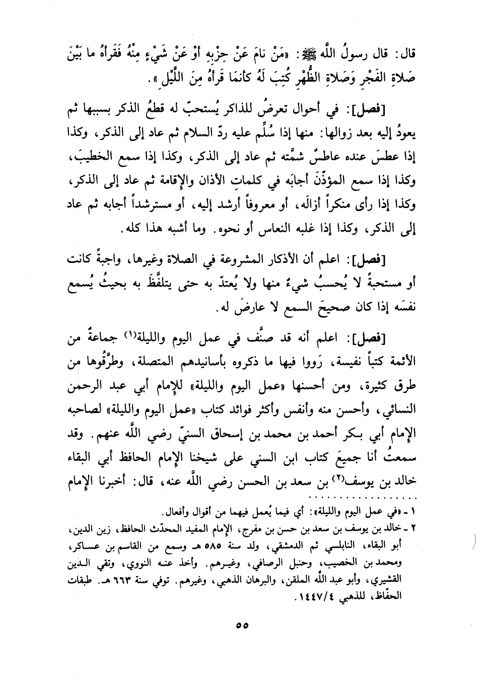 [فصل]: اعلم أنه قد صنَّف في عمل اليوم والليلة (¬1) جماعةٌ من الأئمة كتبًا نفيسة، رَووا فيها ما ذكروه بأسانيدهم المتصلة، وطرَّقُوها من طرق كثيرة، ومن أحسنها "عمل اليوم والليلة" للإِمام أبي عبد الرحمن النسائي، وأحسن منه وأنفس وأكثر فوائد كتاب "عمل اليوم والليلة" لصاحبه الإمام أبي بكر أحمد بن محمد بن إسحاق السنيّ رضي الله عنهم. وقد سمعتُ أنا جميعَ كتاب ابن السني على شيخنا الإمام الحافظ أبي البقاء خالد بن يوسف (¬2) بن سعد بن الحسن رضي الله عنه، قال: أخبرنا الإمام