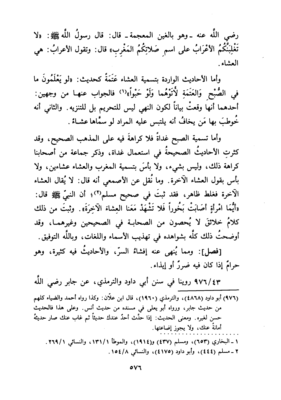 وأما الأحاديث الواردة بتسمية عَتَمَةً كحديث: "لو يَعْلَمُونَ ما في الصُّبْحِ وَالعَتَمَةِ لأَتَوْهُمَا وَلَوْ حَبْوًا" (¬1) فالجواب عنها من وجهين: أحدهما أنها وقعتْ بيانًا لكون النهي ليس للتحريم بل للتنزيه. والثاني أنه خُوطبَ بها مَن يخافُ أنه يلتبس عليه المراد لو سمَّاها عشاءً.
