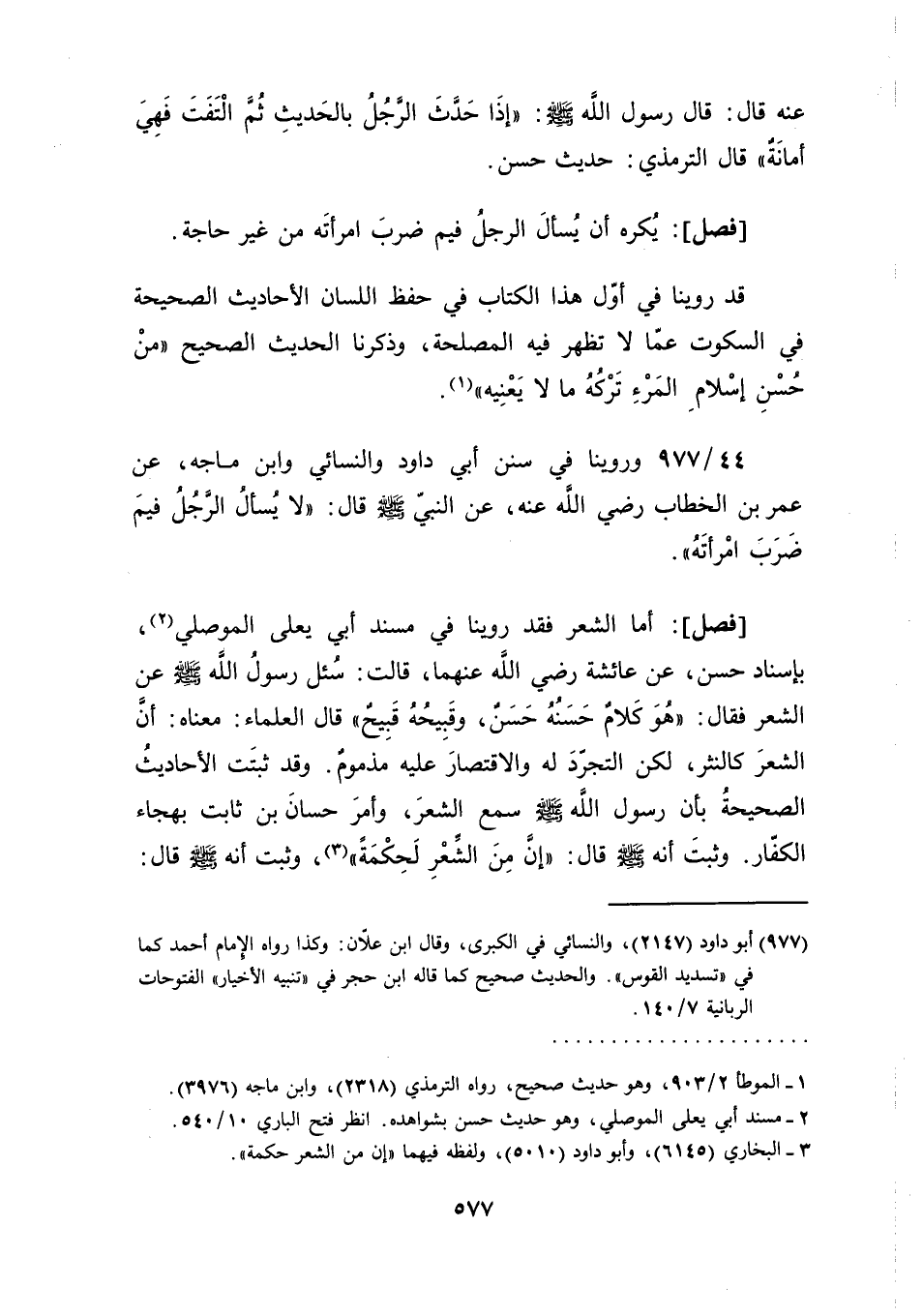 قد روينا في أوّل هذا الكتاب في حفظ اللسان والأحاديث الصحيحة في السكوت عمّا لا تظهر فيه المصلحة، وذكرنا الحديث الصحيح "منْ حُسْنِ إسْلامِ المَرْءِ تَرْكُهُ ما لا يَعْنِيه" (¬1).