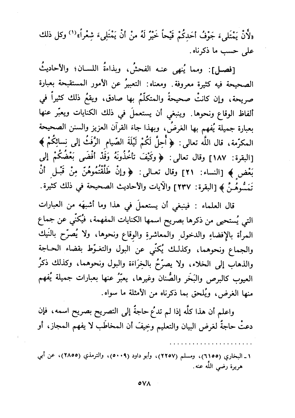 [فصل]: ومما يُنهى عنه الفحشُ، وبذاءةُ اللسان؛ والأحاديثُ الصحيحة فيه كثيرة معروفة. ومعناه: التعبيرُ عن الأمور المستقبحة بعبارة صريحة، وإن كانتْ صحيحةً والمتكلّمُ بها صادق، ويقعُ ذلك كثيرًا في ألفاظ الوقاع ونحوها. وينبغي أن يستعملَ في ذلك الكنايات ويعبّر عنها بعبارة جميلة يُفهم بها الغرضُ، وبهذا جاءَ القرآن العزيز والسن الصحيحة المكرّمة، قال الله تعالى: {أُحِلَّ لَكُمْ لَيْلَةَ الصّيامِ الرَّفَثُ إلى نِسائِكُمْ} [البقرة:187] وقال تعالى: {وَكَيْفَ تَأخُذُونَهُ وَقَدْ أفْضَى بَعْضُكُمْ إلى بَعْضٍ} [النساء:21] وقال تعالى: {وَإنْ طَلَّقْتُمُوهُنَّ مِنْ قَبْلِ أنْ تَمَسُّوهُنَّ} [البقرة: 237] والآيات والأحاديث الصحيحة في ذلك كثيرة.
