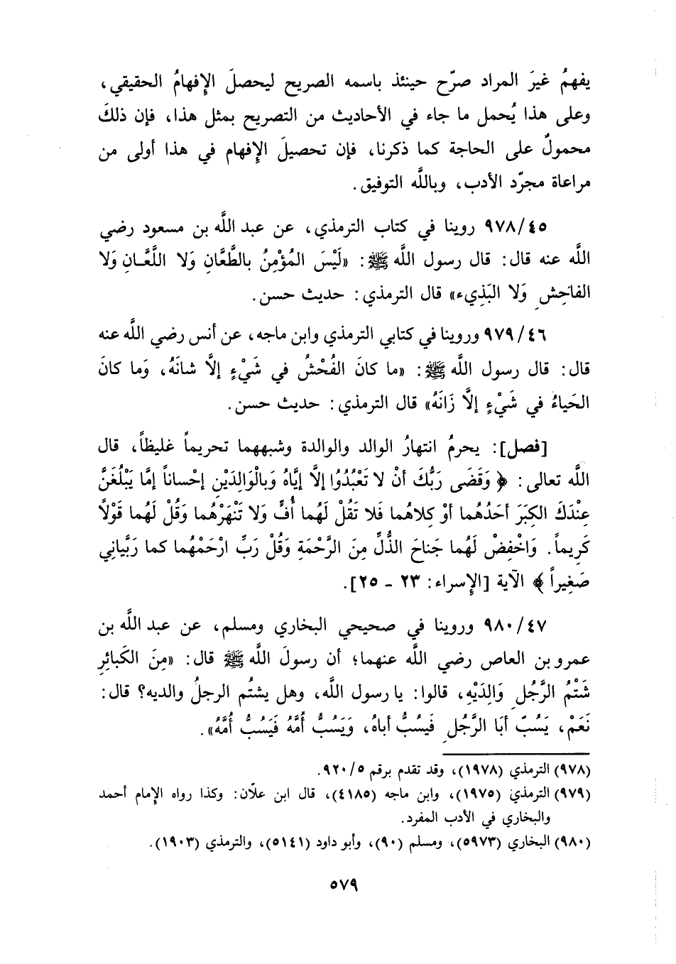 أن رسولَ الله صلى الله عليه وسلم قال: "مِنَ الكَبائرِ شَتْمُ الرَّجُلِ وَالِدَيْهِ، قالوا: يا رسول الله، وهل يشتُم الرجلُ والديه؟ قال: نَعَمْ، يَسُبّ أبَا الرَّجُلِ فَيسبُّ أباهُ، وَيَسُبُّ أُمَّهُ فَيَسُبُّ أُمَّهُ".