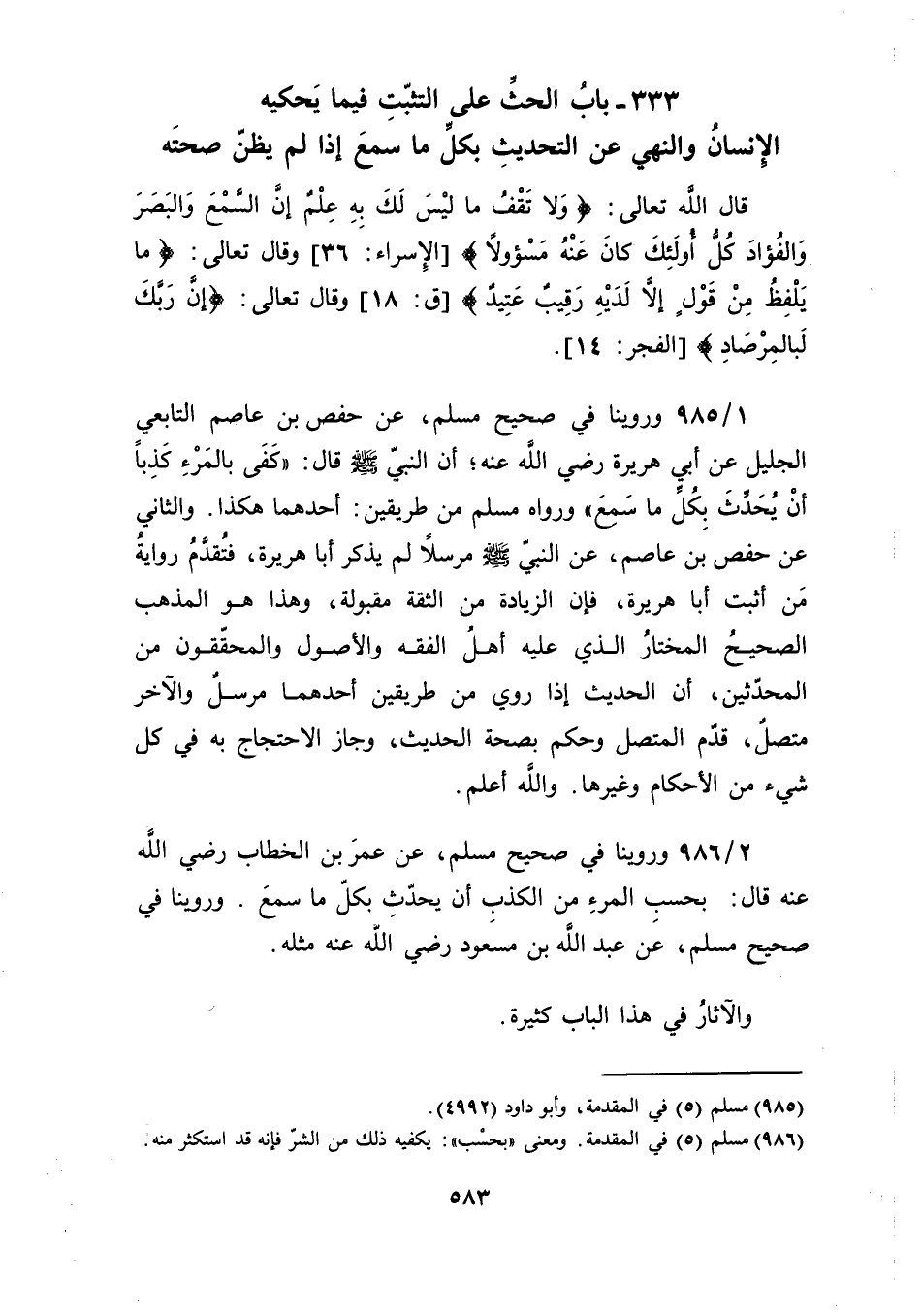 333 ـ بابُ الحثِّ على التثّبت فيما يحكيهِ الإِنسانُ والنهي عن التحديث بكلِّ ما سمعَ إذا لم يظنّ صحته
