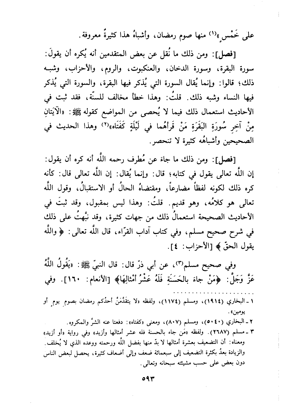 [فصل]: ومن ذلك ما نُقل عن بعض المتقدمين أنه يُكره أن يقولَ: سورة البقرة، وسورة الدخان، والعنكبوت، والروم، والأحزاب، وشبه ذلك؛ قالوا: وإنما يُقال السورة التي يُذكر فيها البقرة، والسورة التي يُذكر فيها النساء وشبه ذلك. قلتُ: وهذا خطأ مخالف للسنّة، فقد ثبت في الأحاديث استعمال ذلك فيما لا يُحصى من المواضع كقوله صلى الله عليه وسلم: "الآيَتانِ مِنْ آخِرِ سُورَةِ البَقَرَةِ مَنْ قَرأهُما في لَيْلَةٍ كَفَتَاه" (¬2) وهذا الحديث في الصحيحين وأشباهُه كثيرة لا تنحصر.