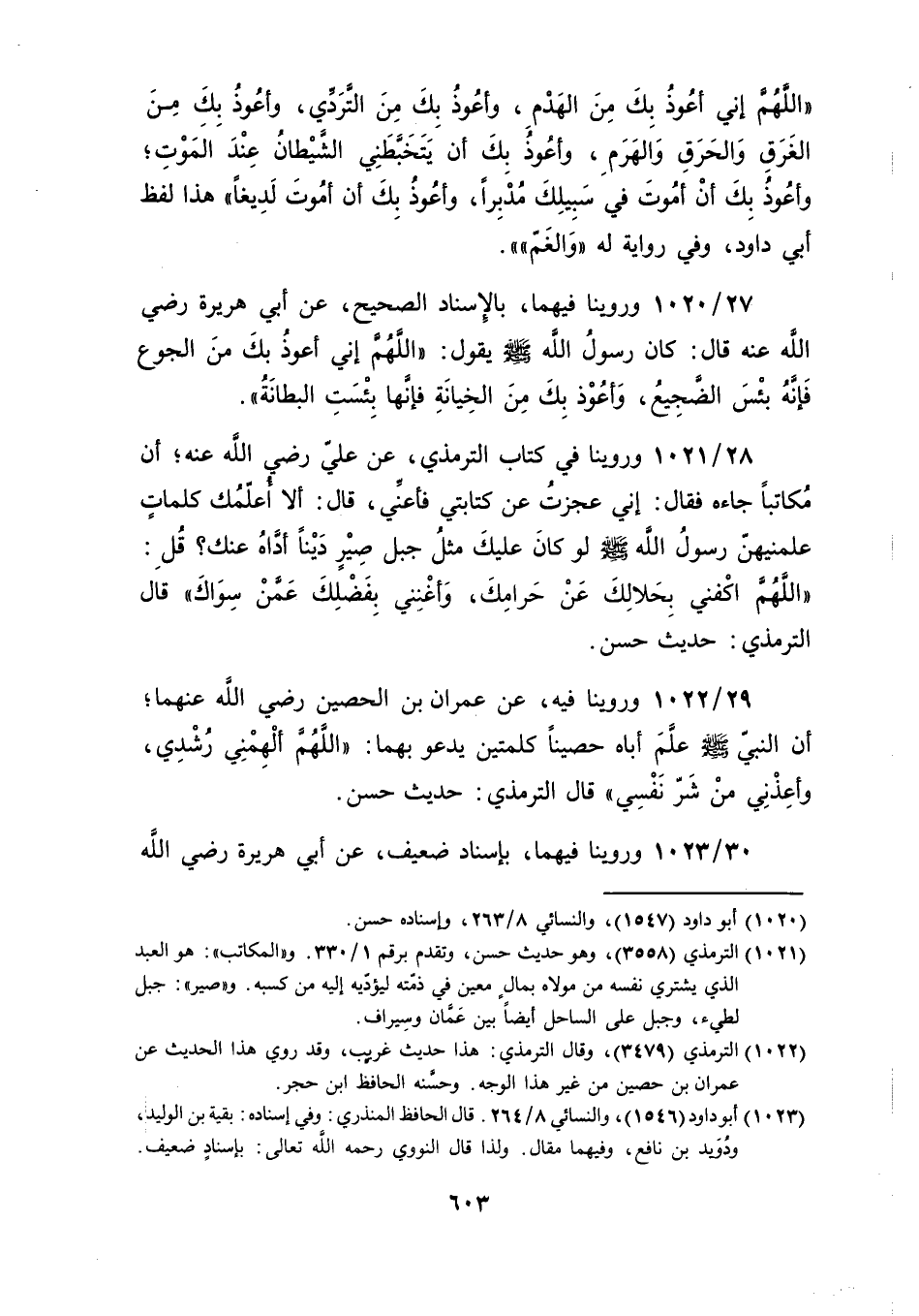 أن مُكاتبًا جاءه فقال: إني عجزتُ عن كتابتي فأعنِّي، قال: ألا أُعلّمُك كلماتٍ عَلمنيهنّ رسولُ الله صلى الله عليه وسلم لو كانَ عَليكَ مثلُ جبل صِيْرٍ دَيْنًا أدَّاهُ عنك؟ قُلِ: "اللَّهُمَّ اكْفني بِحَلالِكَ عَنْ حَرامِكَ، وَأغْنِني بِفَضْلِكَ عَمَّنْ سِوَاكَ" قال الترمذي: حديث حسن.