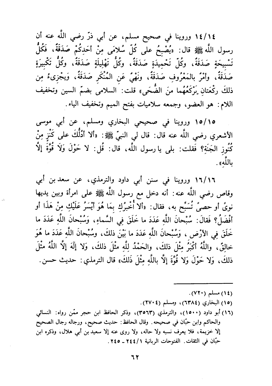 أن رسول الله صلى الله عليه وسلم قال: "يُصْبحُ على كُلّ سُلامَى مِنْ أحَدِكُمْ صَدَقَةٌ، فَكُلُّ تَسْبِيحَةٍ صَدَقَةٌ، وكُلّ تَحْمِيدَةٍ صَدَقَةٌ، وكُلُّ تَهْلِيلَةٍ صَدَقَةٌ، وكُلُّ تَكْبِيرَةٍ صَدَقَةٌ، وَأَمْرٌ بالمَعْرُوفِ صَدَقَةٌ، وَنَهْيٌ عَنِ المُنْكَرِ صَدَقَةٌ، وَيجْزِىءُ مِن ذلكَ ركْعَتانِ يَرْكَعُهُما منَ الضُّحَى" قلت: السلامى بضمّ السين وتخفيف اللام: هو العضو، وجمعه سلاميات بفتح الميم وتخفيف الياء.