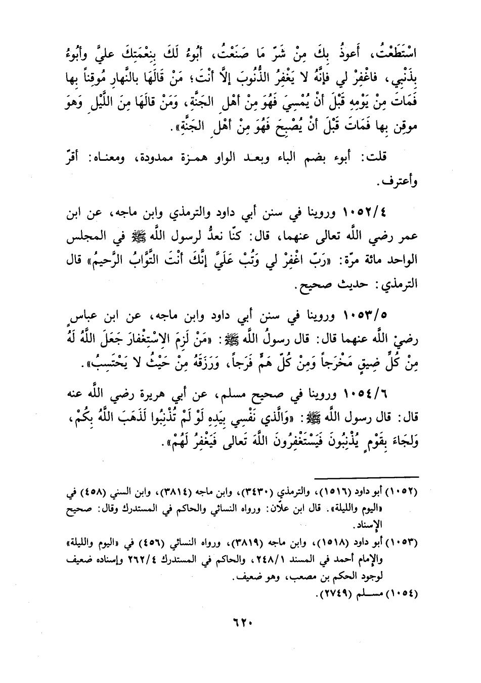 عن ابن عمر رضي الله تعالى عنهما، قال: كنّا نعدُّ لرسول الله صلى الله عليه وسلم في المجلس الواحد مِئَةَ مرّة: "ربّ اغْفِرْ لي وَتُبْ عَلَيَّ إنَّكَ أنْتَ التَّوَّابُ الرَّحيمُ" قال الترمذي: حديث صحيح.