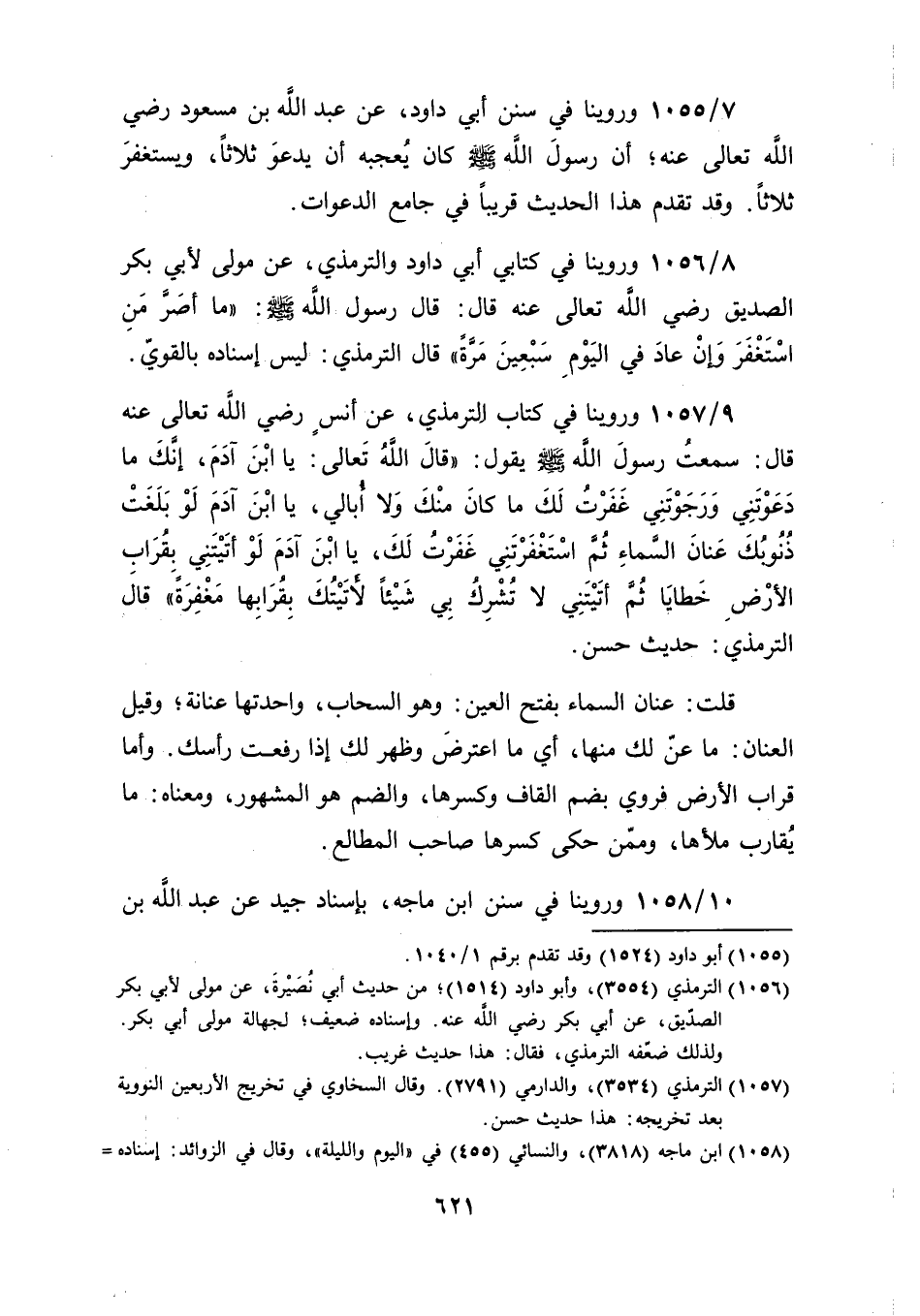 قال رسول الله صلى الله عليه وسلم: "ما أصَرَّ مَنِ اسْتَغْفَرَ وَإنْ عادَ في اليَوْمِ سَبْعِينَ مَرَّةً" قال الترمذي: ليس إسناده بالقويّ.
