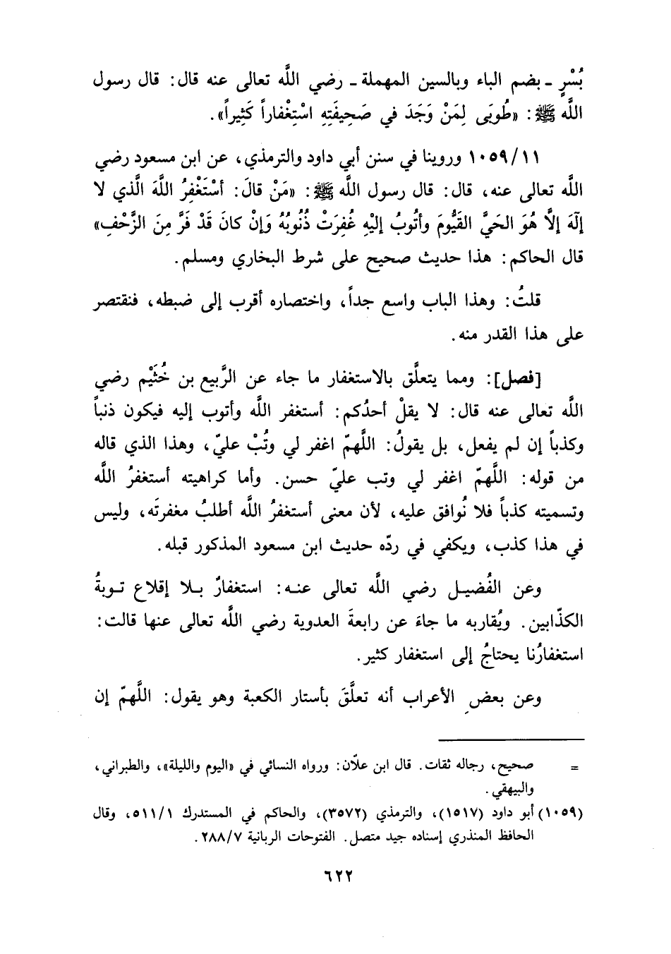 [فصل]: ومما يتعلَّق بالاستغفار ما جاء عن الرَّبيع بن خُثَيْم رضي الله تعالى عنه قال: لا يقلْ أحدُكم: أستغفر الله وأتوب إليه فيكون ذنبًا وكذبًا إن لم يفعل، بل يقولُ: اللَّهمّ اغفر لي وتُبْ عليّ، وهذا الذي قاله من قوله: اللَّهمّ اغفر لي وتب عليّ حسن.