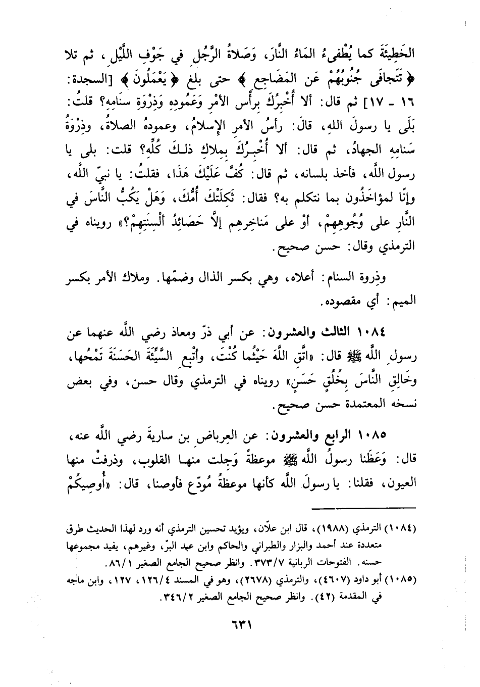 الخَطِيئَةَ كما يُطْفىءُ المَاءُ النَّارَ، وَصَلاةُ الرَّجُلِ في جَوْفِ اللَّيْلِ، ثم تلا {تَتَجافَى جُنُوبُهُمْ عَن المَضَاجِع} حتى بلغ {يَعْمَلُونَ} [السجدة:16ـ17] ثم قال: ألا أُخْبِرُكَ بِرأْس الأمْرِ وَعَمُودِهِ وَذِرْوَةِ سنَامِهِ؟ قلتُ: بَلَى يا رسولَ اللَّهِ! قالَ: رأسُ الأمر الإِسلامُ، وعمودهُ الصلاةُ، وذِرْوَةُ سَنامِهِ الجِهادُ، ثم قال: ألا أُخْبِرُكَ بِمِلاكِ ذلكَ كُلِّهِ؟ قلت: بلى يا رسول الله! فأخذ بلسانه، ثم قال: كُفَّ عَلَيْكَ هَذَا، فقلتُ: يا نبيّ الله! وإنّا لمؤاخَذُونَ بما نتكلم به؟ فقال: ثَكِلَتْكَ أُمُّكَ، وَهَلْ يَكُبُّ النَّاسَ في النَّارِ على وُجُوهِهِمْ، أوْ على مَناخِرهِم إلاَّ حَصَائِدُ ألْسِنَتِهِمْ؟ " رويناه في الترمذي وقال: حسن صحيح.