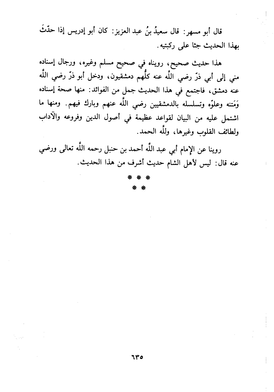 روينا عن الإِمام أبي عبد الله أحمد بن حنبل رحمه الله تعالى ورضي عنه قال: ليس لأهل الشام حديث أشرف من هذا الحديث.