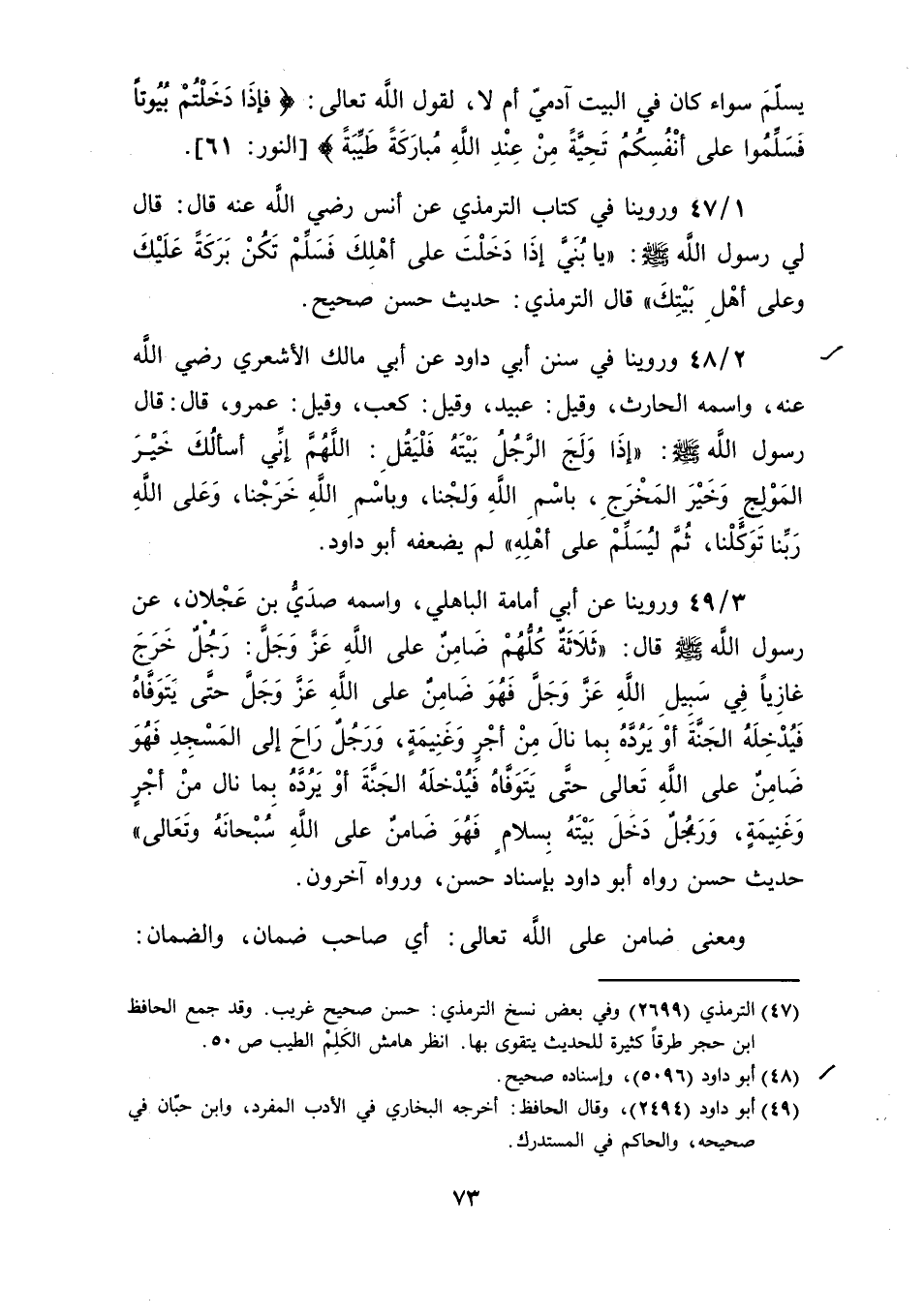 عن رسول الله صلى الله عليه وسلم قال: "ثَلاَثَةٌ كُلُّهُمْ ضَامِنٌ على اللَّهِ عَزَّ وَجَلَّ: رَجُلٌ خَرَجَ غَازِيًا في سَبِيلِ اللَّهِ عَزَّ وَجَلَّ فَهُوَ ضَامِنٌ على الله عَزَّ وجَلَّ حَتَّى يَتَوفَّاهُ فَيُدْخِلَهُ الجَنَّةَ أوْ يَرُدَّهُ بِما نال مِنْ أجْرٍ وَغَنِيمَةٍ، وَرَجُلٌ رَاحَ إلى المَسْجِد فَهُو ضَامِنٌ على الله تعالى حتَّى يَتَوَفَّاهُ فَيُدْخلَهُ الجَنَّةَ أَوْ يَرُدَّهُ بما نال من أجْرٍ وَغَنِيمَةٍ، وَرَجُلٌ دَخَلَ بَيْتَهُ بِسلامٍ فَهُوَ ضَامنٌ على اللَّهِ سُبْحانَهُ وتَعَالى" حديث حسن رواه أبو داود بإسناد حسن، ورواه آخرون.