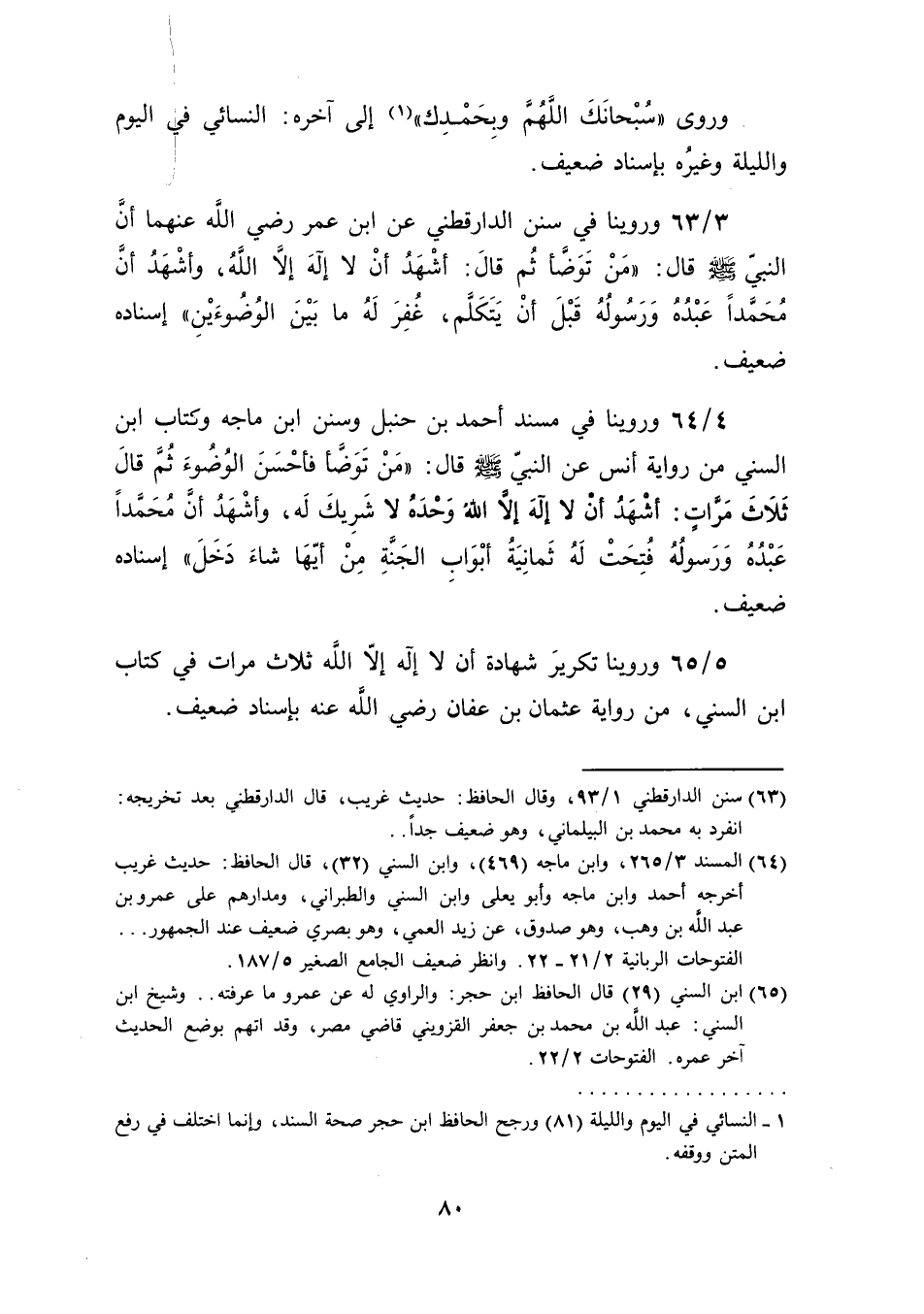 [64] المسند 3/ 265، وابن ماجه (469)، وابن السني (32)، قال الحافظ: حديث غريب أخرجه أحمد وابن ماجه وأبو يعلى وابن السني والطبراني، ومدارهم على عمر بن عبد الله بن وهب، وهو صدوق، عن زيد العمي، وهو بصري ضعيف عند الجمهور ... الفتوحات الربانية 2/ 21ـ22. وانظر ضعيف الجامع الصغير 5/ 187.
