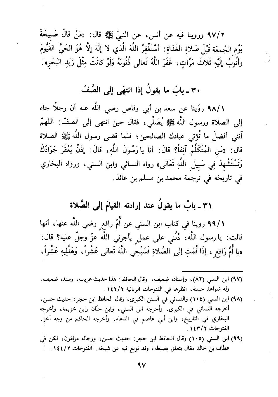 [97] ابن السني (82)، وإسناده ضعيف، وقال الحافظ: هذا حديث غريب، وسنده ضعيف. وله شواهد حسنة، انظرها في الفتوحات الربانية 2/ 142.