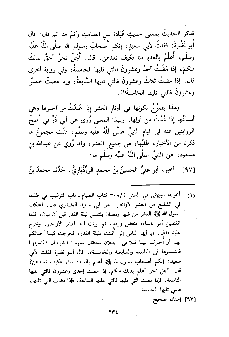97 - أَخْبَرَنَا أَبُو عَلِيٍّ الْحُسَيْنُ بْنُ مُحَمَّدٍ الرُّوذْبَارِيُّ، حَدَّثَنَا مُحَمَّدُ بْنُ -[235]- بَكْرٍ، حَدَّثَنَا أَبُو دَاوُدَ، حَدَّثَنَا حَكِيمُ بْنُ سَيْفٍ الْبَرْقِيُّ، حَدَّثَنَا عُبَيْدُ اللَّهِ يَعْنِي ابْنَ عَمْرٍو، عَنْ زَيْدٍ يَعْنِي ابْنَ أَبِي أُنَيْسَةَ، عَنْ أَبِي إِسْحَاقَ، عَنْ عَبْدِ الرَّحْمَنِ بْنِ الْأَسْوَدِ، عَنْ أَبِيهِ، عَنِ ابْنِ مَسْعُودٍ، قَالَ لَنَا رَسُولُ اللَّهِ صَلَّى اللهُ عَلَيْهِ وَسَلَّمَ: «§اطْلُبُوهَا لَيْلَةَ سَبْعَ عَشْرَةَ مِنْ رَمَضَانَ وَلَيْلَةَ إِحْدَى وَعِشْرِينَ، وَلَيْلَةَ ثَلَاثٍ وَعِشْرِينَ» ثُمَّ سَكَتَ