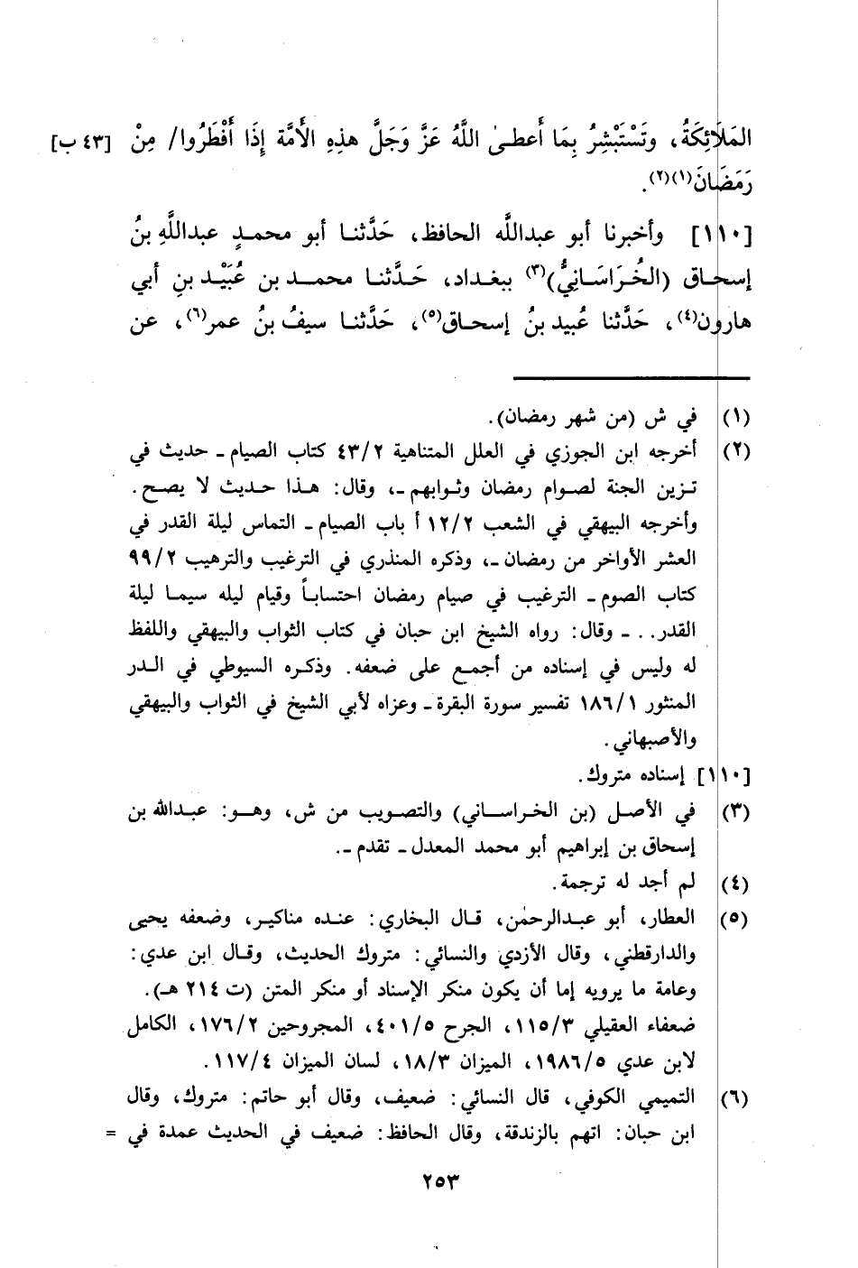 110 - وَأَخْبَرَنَا أَبُو عَبْدِ اللَّهِ الْحَافِظُ، حَدَّثَنَا أَبُو مُحَمَّدِ بْنُ عَبْدِ اللَّهِ بْنِ إِسْحَاقَ الْخُرَاسَانِيُّ، بِبَغْدَادَ، حَدَّثَنَا مُحَمَّدُ بْنُ عُبَيْدِ بْنِ أَبِي هَارُونَ، حَدَّثَنَا عُبَيْدُ بْنُ إِسْحَاقَ، حَدَّثَنَا سَيْفُ بْنُ عُمَرَ، عَنْ -[254]- سَعْدِ بْنِ طَرِيفٍ، عَنِ الْأَصْبَغِ، عَنْ عَلِيٍّ رَضِيَ اللَّهُ عَنْهُ قَالَ: §أَنَا حَرَّضْتُ عُمَرَ رَضِيَ اللَّهُ عَنْهُ عَلَى الْقِيَامِ فِي شَهْرِ رَمَضَانَ أَخْبَرْتُهُ أَنَّ فَوْقَ السَّمَاءِ السَّابِعَةِ حَظِيرَةً يُقَالُ لَهَا حَظِيرَةُ الْقُدُسِ يَسْكُنُهَا قَوْمٌ يُقَالُ لَهُمُ الرُّوحُ، فَإِذَا كَانَ لَيْلَةُ الْقَدْرِ اسْتَأْذَنُوا رَبَّهُمْ فِي النُّزُولِ إِلَى الدُّنْيَا، فَلَا يَمُرُّونَ بِأَحَدٍ يُصَلِّي أَوْ عَلَى الطَّرِيقِ إِلَّا أَصَابَتْهُ مِنْهُمْ بَرَكَةٌ، فَقَالَ لَهُ عُمَرُ: يَا أَبَا الْحَسَنِ فَتُحَرِّضُ النَّاسَ عَلَى الصَّلَاةِ حَتَّى تُصِيبَهُمُ الْبَرَكَةُ، فَأَمَرَ النَّاسَ بِالْقِيَامِ قَالَ الشَّيْخُ رَضِيَ اللَّهُ عَنْهُ: تَفَرَّدَ بِهِ عُبَيْدُ بْنُ إِسْحَاقَ الْعَطَّارُ، عَنْ -[255]- سَيْفِ بْنِ عُمَرَ هُوَ إِنْ صَحَّ مَعَ مَا قَبْلَهُ فَفِيهِمَا إِخْبَارٌ عَنْ نُزُولِ الْمَلَائِكَةِ وَتَسْلِيمِهِمْ عَلَى الْمُسْلِمِينَ لَيْلَةَ الْقَدْرِ، وَفِي كِتَابِ اللَّهِ تَعَالَى بَيَانُ ذَلِكَ