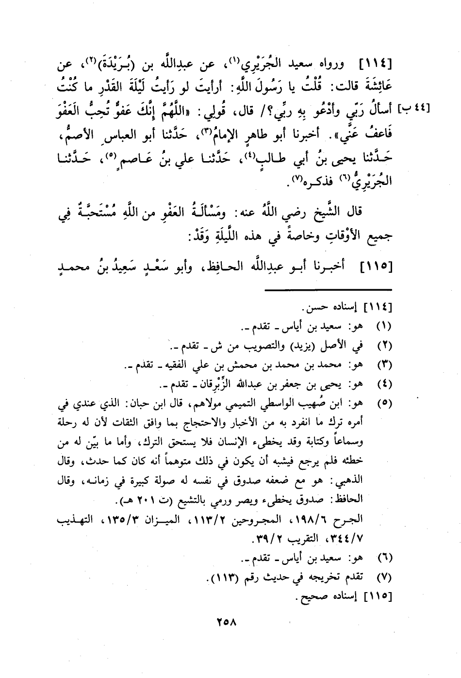 115 - أَخْبَرَنَا أَبُو عَبْدِ اللَّهِ الْحَافِظُ، وَأَبُو سَعْدٍ سَعِيدُ بْنُ مُحَمَّدٍ -[259]- الشَّعْبِيُّ، قَالَا: سَمِعْنَا أَبَا عُمَرَ بْنَ أَبِي جَعْفَرٍ، يَقُولُ: سَمِعْتُ أَبَا عُثْمَانَ سَعِيدَ بْنَ إِسْمَاعِيلَ كَثِيرًا يَقُولُ فِي مَجْلِسِهِ وَفِي غَيْرِ الْمَجْلِسِ: §عَفْوَكَ يَا عَفُوُّ عَفْوَكَ، وَفِي الْمَحْيَا عَفْوَكَ، وَفِي الْمَمَاتِ عَفْوَكَ، وَفِي الْقُبُورِ عَفْوَكَ، وَعِنْدَ النُّشُورِ عَفْوَكَ، وَعِنْدَ تَطَايُرِ الصُّحُفِ عَفْوَكَ، وَفِي الْقِيَامَةِ عَفْوَكَ، وَفِي مُنَاقَشَةِ الْحِسَابِ عَفْوَكَ، وَعِنْدَ مَمَرِّ الصِّرَاطِ عَفْوَكَ، وَعِنْدَ الْمِيزَانِ عَفْوَكَ، وَفِي جَمِيعِ الْأَحْوَالِ عَفْوَكَ يَا عَفُوُّ عَفْوَكَ، قَالَ أَبُو عَمْرٍو: فَرُئِي أَبُو عُثْمَانَ فِي الْمَنَامِ بَعْدَ وَفَاتِهِ بِأَيَّامٍ، فَقِيلَ لَهُ: مَاذَا انْتَفَعْتَ بِأَعْمَالِكَ فِي الدُّنْيَا؟ فَقَالَ: بِقَوْلِي: عَفْوَكَ عَفْوَكَ