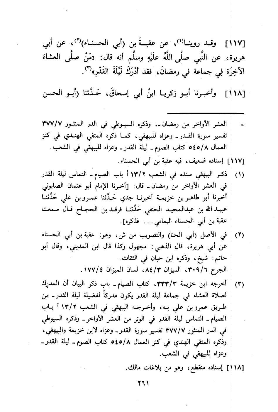 117 - وَقَدْ رُوِّينَا عَنْ عُقْبَةَ بْنِ أَبِي الْحَسْنَاءِ، عَنْ أَبِي هُرَيْرَةَ، عَنِ النَّبِيِّ صَلَّى اللهُ عَلَيْهِ وَسَلَّمَ أَنَّهُ قَالَ: §«مَنْ صَلَّى الْعِشَاءَ الْآخِرَةَ فِي جَمَاعَةٍ فِي رَمَضَانَ فَقَدْ أَدْرَكَ لَيْلَةَ الْقَدْرِ»