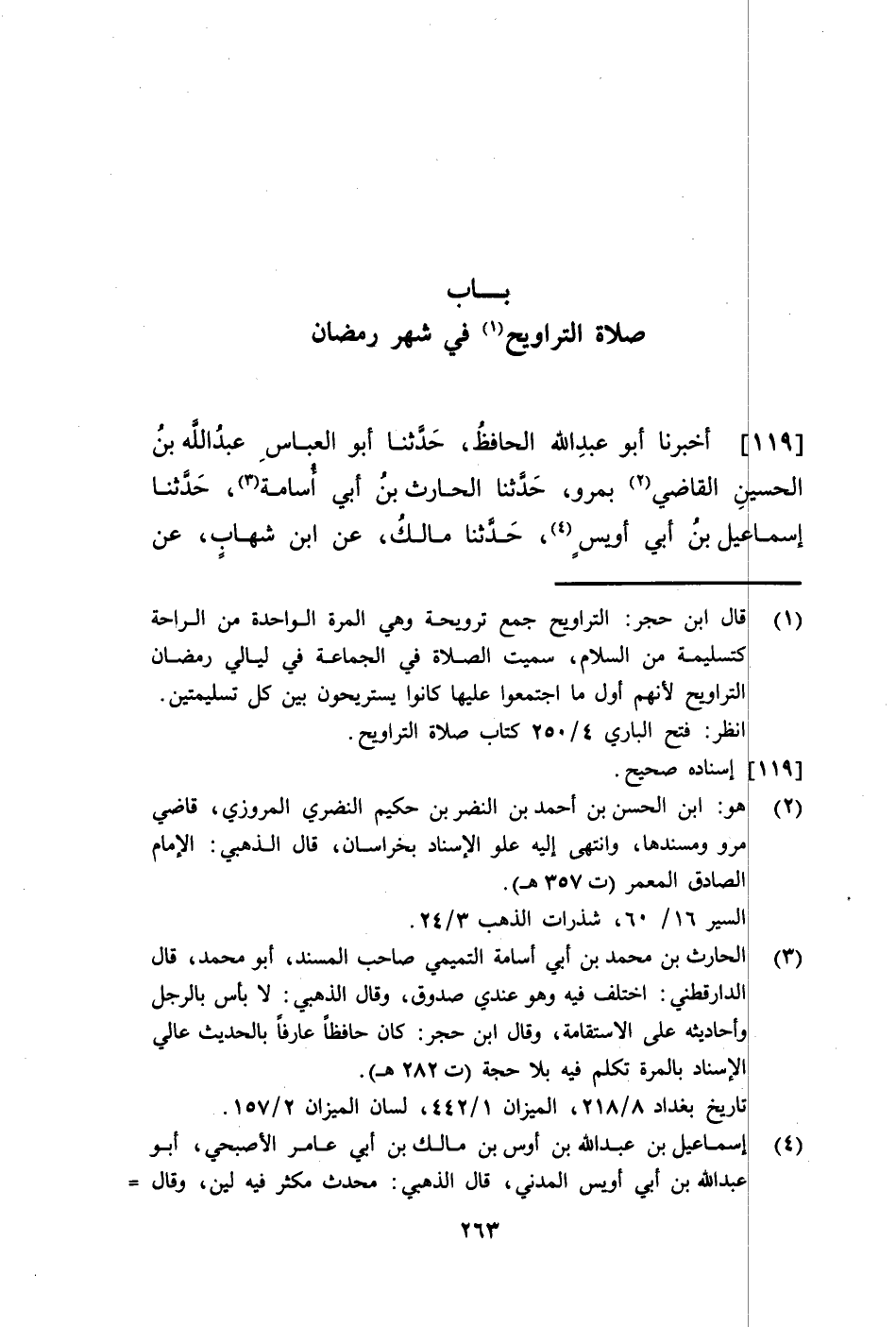 119 - أَخْبَرَنَا أَبُو عَبْدِ اللَّهِ الْحَافِظُ، حَدَّثَنَا أَبُو الْعَبَّاسِ عَبْدُ اللَّهِ بْنُ الْحُسَيْنِ الْقَاضِي، بِمَرْوَ، حَدَّثَنَا الْحَارِثُ بْنُ أَبِي أُسَامَةَ، حَدَّثَنَا إِسْمَاعِيلُ بْنُ أَبِي أُوَيْسٍ، حَدَّثَنَا مَالِكٌ، عَنِ ابْنِ شِهَابٍ، عَنْ -[264]- عُرْوَةَ، عَنْ عَائِشَةَ، زَوْجِ النَّبِيِّ صَلَّى اللهُ عَلَيْهِ وَسَلَّمَ أَنَّ رَسُولَ اللَّهِ صَلَّى اللهُ عَلَيْهِ وَسَلَّمَ صَلَّى فِي الْمَسْجِدِ ذَاتَ لَيْلَةٍ فَصَلَّى بِصَلَاتِهِ نَاسٌ، ثُمَّ صَلَّى مِنَ الْقَابِلَةِ فَكَثُرَ النَّاسُ، ثُمَّ اجْتَمَعُوا مِنَ اللَّيْلَةِ الثَّالِثَةِ أَوِ الرَّابِعَةِ وَلَمْ يَخْرُجْ إِلَيْهِمْ رَسُولُ اللَّهِ صَلَّى اللهُ عَلَيْهِ وَسَلَّمَ، فَلَمَّا أَصْبَحَ قَالَ: §«قَدْ رَأَيْتُ الَّذِيَ صَنَعْتُمْ فَلَمْ يَمْنَعْنِي مِنَ الْخُرُوجِ إِلَيْكُمْ إِلَّا أَنِّي خَشِيتُ أَنْ تُفْرَضَ عَلَيْكُمْ» قَالَ: وَذَلِكَ فِي رَمَضَانَ