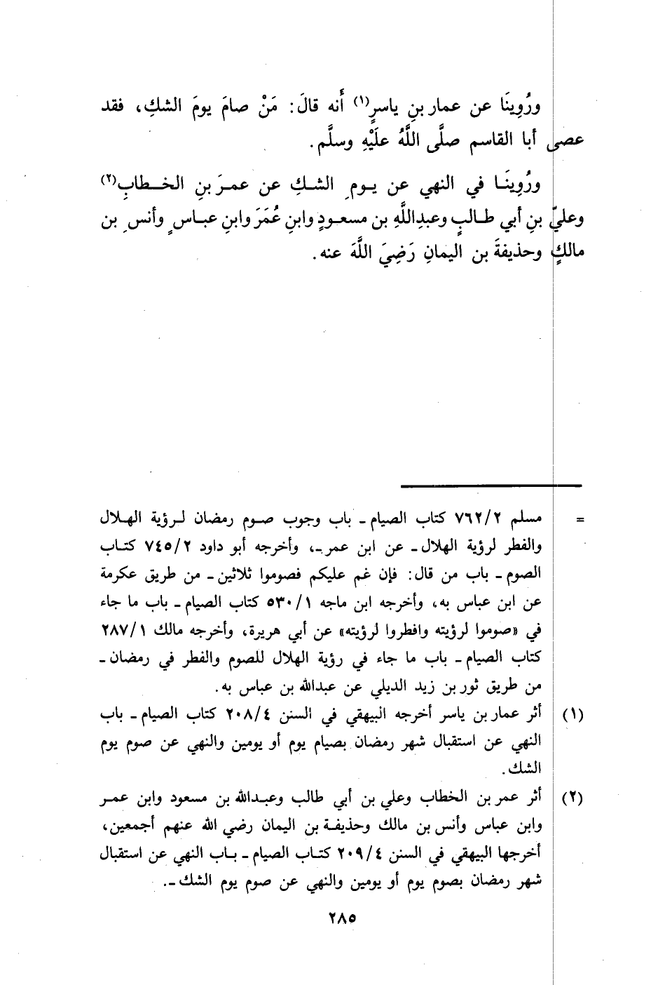 وَرُوِّينَا , عَنْ عَمَّارِ بْنِ يَاسِرٍ، أَنَّهُ قَالَ: §«مَنْ صَامَ يَوْمَ الشَّكِّ فَقَدْ عَصَى أَبَا الْقَاسِمِ صَلَّى اللهُ عَلَيْهِ وَسَلَّمَ» وَرُوِّينَا فِي النَّهْيِ عَنْ يَوْمِ الشَّكِّ عَنْ عُمَرَ بْنِ الْخَطَّابِ، وَعَلِيِّ بْنِ أَبِي طَالِبٍ، وَعَبْدِ اللَّهِ بْنِ مَسْعُودٍ، وَابْنِ عُمَرَ، وَابْنِ عَبَّاسٍ، وَأَنَسِ بْنِ مَالِكٍ، وَحُذَيْفَةَ بْنِ الْيَمَانِ رَضِيَ اللَّهُ عَنْهُمْ