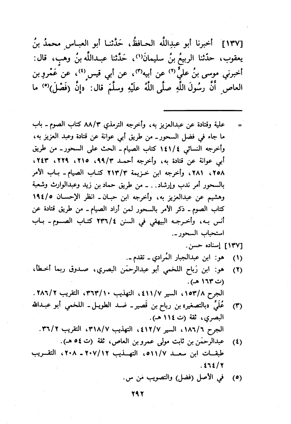 137 - أَخْبَرَنَا أَبُو عَبْدِ اللَّهِ الْحَافِظُ، حَدَّثَنَا أَبُو الْعَبَّاسِ مُحَمَّدُ بْنُ يَعْقُوبَ، حَدَّثَنَا الرَّبِيعُ بْنُ سُلَيْمَانَ، حَدَّثَنَا عَبْدُ اللَّهِ بْنُ وَهْبٍ، قَالَ: أَخْبَرَنِي مُوسَى بْنُ عَلِيٍّ، عَنْ أَبِيهِ، عَنْ أَبِي قَيْسٍ، عَنْ عَمْرِو بْنِ الْعَاصِ، أَنَّ رَسُولَ اللَّهِ صَلَّى اللهُ عَلَيْهِ وَسَلَّمَ قَالَ: §«إِنَّ فَصْلَ مَا -[293]- بَيْنَ صِيَامِنَا وَصِيَامِ أَهْلِ الْكِتَابِ أَكْلَةُ السَّحَرِ»