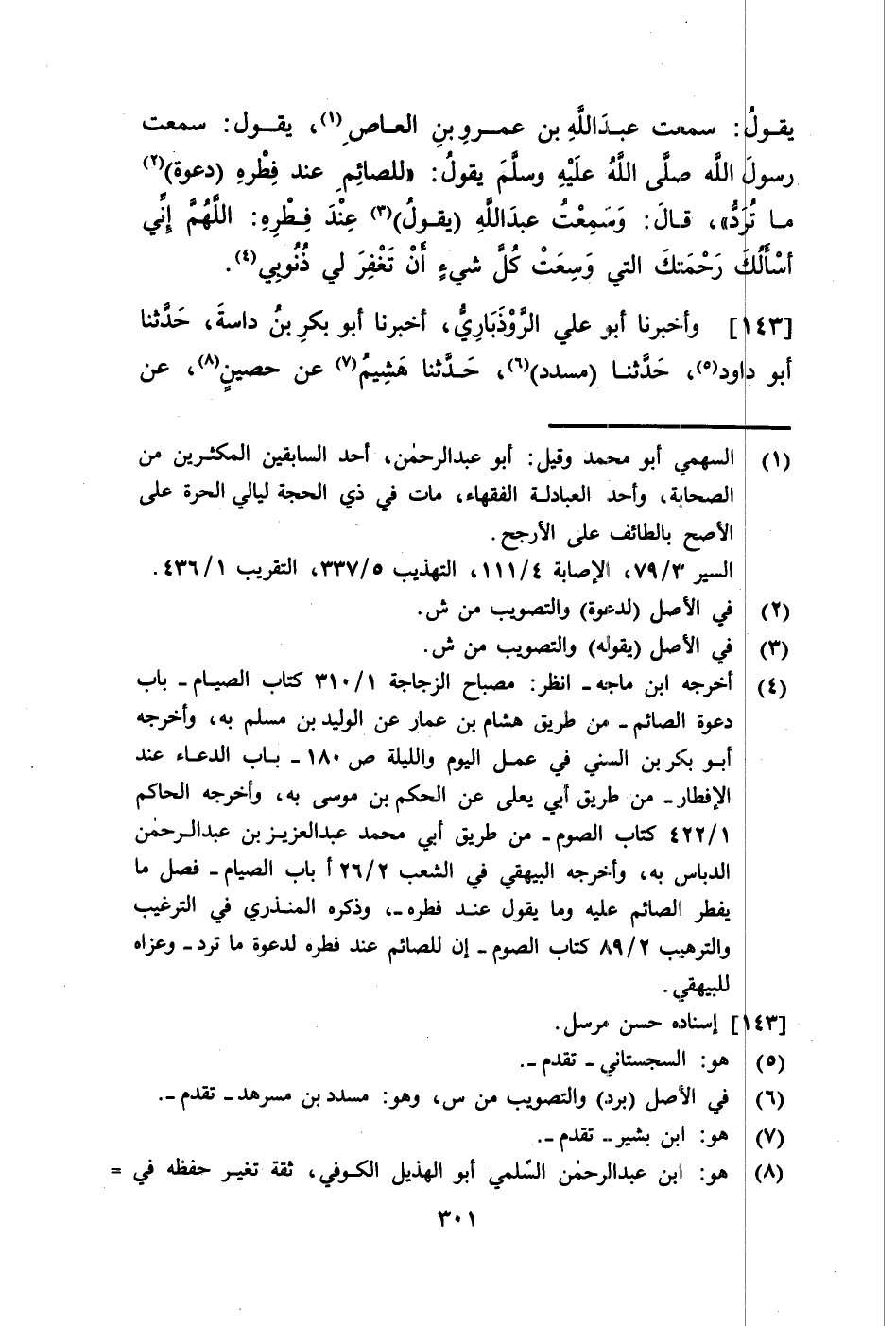 143 - وَأَخْبَرَنَا أَبُو عَلِيٍّ الرُّوذْبَارِيُّ، أَخْبَرَنَا أَبُو بَكْرِ بْنُ دَاسَةَ، حَدَّثَنَا أَبُو دَاوُدَ، حَدَّثَنَا مُسَدَّدٌ، حَدَّثَنَا هُشَيْمٌ، عَنْ حُصَيْنٍ، عَنْ -[302]- مُعَاذِ بْنِ زُهْرَةَ، أَنَّهُ بَلَغَهُ أَنَّ رَسُولَ اللَّهِ صَلَّى اللهُ عَلَيْهِ وَسَلَّمَ كَانَ إِذَا أَفْطَرَ قَالَ: §«اللَّهُمَّ لَكَ صُمْتُ وَعَلَى رِزْقِكَ أَفْطَرْتُ» قَالَ الشَّيْخُ رَضِيَ اللَّهُ عَنْهُ: وَرَوَاهُ الثَّوْرِيُّ عَنْ حُصَيْنٍ، عَنْ رَجُلٍ، عَنْ مُعَاذٍ غَيْرَ أَنَّهُ قَالَ: «الْحَمْدُ لِلَّهِ الَّذِي أَعَانَنِي فَصُمْتُ، وَرَزَقَنِي فَأَفْطَرْتُ» وَرُوِّينَا عَنِ ابْنِ عُمَرَ أَنَّهُ كَانَ يَقُولُ عِنْدَ إِفْطَارِهِ: يَا وَاسِعَ الْمَغْفِرَةِ اغْفِرْ لِي