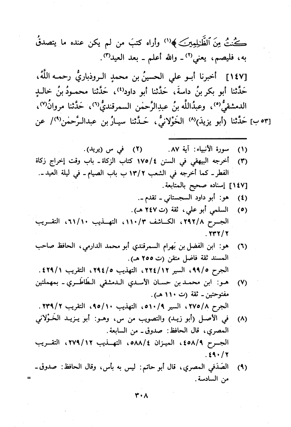 147 - أَخْبَرَنَا أَبُو عَلِيٍّ الْحُسَيْنُ بْنُ مُحَمَّدٍ الرُّوذْبَارِيُّ، رَحِمَهُ اللَّهُ، حَدَّثَنَا أَبُو بَكْرِ بْنُ دَاسَةَ، حَدَّثَنَا أَبُو دَاوُدَ، حَدَّثَنَا مَحْمُودُ بْنُ خَالِدٍ الدِّمَشْقِيُّ، وَعَبْدُ اللَّهِ بْنُ عَبْدِ الرَّحْمَنِ السَّمَرْقَنْدِيُّ، حَدَّثَنَا مَرْوَانُ، حَدَّثَنَا أَبُو يَزِيدَ الْخَوْلَانِيُّ، حَدَّثَنَا سَيَّارُ بْنُ عَبْدِ الرَّحْمَنِ، عَنْ عِكْرِمَةَ، عَنِ ابْنِ عَبَّاسٍ، رَضِيَ اللَّهُ عَنْهُمَا قَالَ: §فَرَضَ رَسُولُ اللَّهِ صَلَّى اللهُ عَلَيْهِ وَسَلَّمَ زَكَاةَ الْفِطْرِ طُهْرَةً لِلصَّائِمِ عَنِ اللَّغْوِ وَالرَّفَثِ وَطُعْمَةً لِلْمَسَاكِينِ، مَنْ أَدَّاهَا قَبْلَ الصَّلَاةِ فَهِيَ زَكَاةٌ مَقْبُولَةٌ، وَمَنْ أَدَّاهَا بَعْدَ الصَّلَاةِ فَهِيَ صَدَقَةٌ مِنَ الصَّدَقَاتِ "