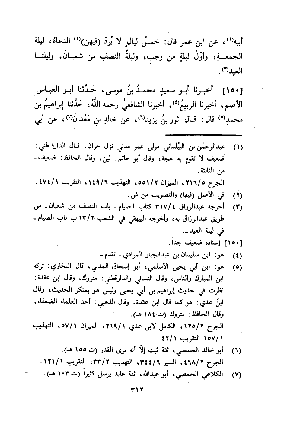 150 - أَخْبَرَنَا أَبُو سَعِيدٍ مُحَمَّدُ بْنُ مُوسَى، حَدَّثَنَا أَبُو الْعَبَّاسِ الْأَصَمُّ، أَنْبَأَنَا الرَّبِيعُ، أَنْبَأَنَا الشَّافِعِيُّ، رَحِمَهُ اللَّهُ، حَدَّثَنَا إِبْرَاهِيمُ بْنُ مُحَمَّدٍ، قَالَ: قَالَ ثَوْرُ بْنُ يَزِيدَ، عَنْ خَالِدِ بْنِ مَعْدَانَ، عَنْ أَبِي الدَّرْدَاءِ، قَالَ: §مَنْ قَامَ لَيْلَتَيِ الْعِيدَيْنِ مُحْتَسِبًا لِلَّهِ لَمْ يَمُتْ قَلْبُهُ حِينَ تَمُوتُ الْقُلُوبُ " قَالَ الشَّافِعِيُّ رَحِمَهُ اللَّهُ: وَبَلَغَنَا أَنَّهُ كَانَ يُقَالُ: إِنَّ الدُّعَاءَ يُسْتَجَابُ فِي خَمْسِ لَيَالٍ، فَذَكَرَ مَا رُوِّينَا عَنِ ابْنِ عُمَرَ