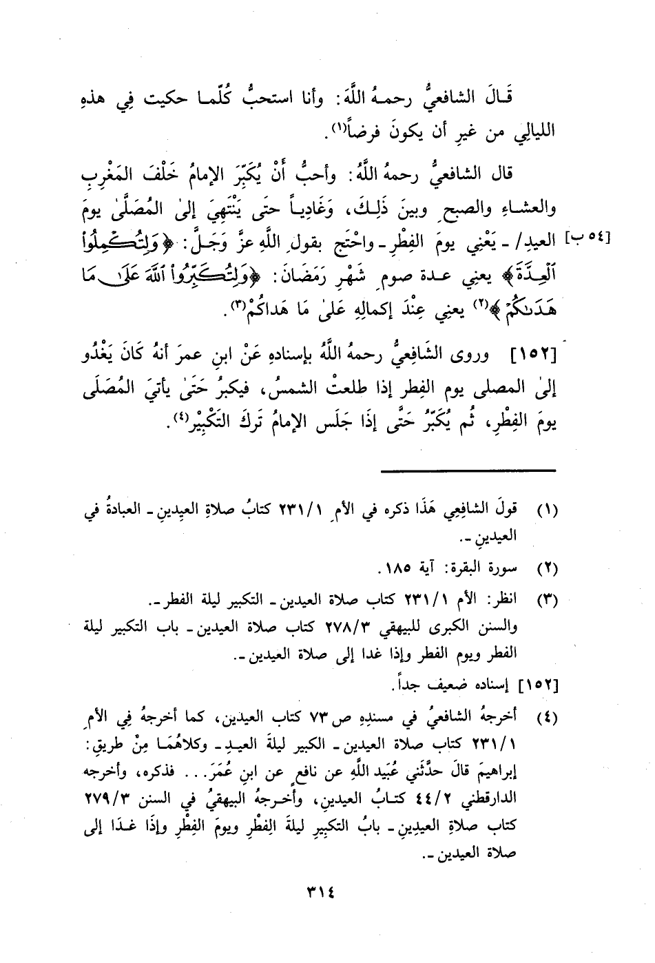 152 - وَرَوَى الشَّافِعِيُّ، رَحِمَهُ اللَّهُ بِإِسْنَادِهِ عَنِ ابْنِ عُمَرَ، أَنَّهُ §كَانَ يَغْدُو إِلَى الْمُصَلَّى يَوْمَ الْفِطْرِ إِذَا طَلَعَتِ الشَّمْسُ فَيُكَبِّرُ حَتَّى يَأْتِيَ الْمُصَلَّى يَوْمَ الْفِطْرِ ثُمَّ يُكَبِّرُ حَتَّى إِذَا جَلَسَ الْإِمَامُ تَرَكَ التَّكْبِيرَ