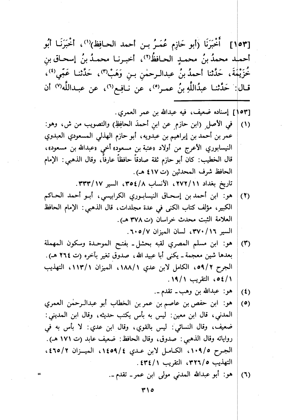 153 - أَخْبَرَنَا أَبُو حَازِمٍ عُمَرُ بْنُ أَحْمَدَ الْحَافِظُ، أَخْبَرَنَا أَبُو أَحْمَدَ مُحَمَّدُ بْنُ مُحَمَّدٍ الْحَافِظُ، أَخْبَرَنَا مُحَمَّدُ بْنُ إِسْحَاقَ بْنِ خُزَيْمَةَ، حَدَّثَنَا أَحْمَدُ بْنُ عَبْدِ الرَّحْمَنِ بْنِ وَهْبٍ، حَدَّثَنَا عَمِّي، قَالَ: حَدَّثَنَا عَبْدُ اللَّهِ بْنُ عُمَرَ، عَنْ نَافِعٍ، عَنْ عَبْدِ اللَّهِ، أَنَّ -[316]- رَسُولَ اللَّهِ صَلَّى اللهُ عَلَيْهِ وَسَلَّمَ §كَانَ يَخْرُجُ فِي الْعِيدَيْنِ مَعَ الْفَضْلِ بْنِ الْعَبَّاسِ، وَعَبْدِ اللَّهِ، وَالْعَبَّاسِ، وَعَلِيٍّ، وَجَعْفَرٍ، وَالْحَسَنِ، وَالْحُسَيْنِ، وَأُسَامَةَ بْنِ زَيْدٍ، وَزَيْدِ بْنِ حَارِثَةَ، وَأَيْمَنَ بْنِ أُمِّ أَيْمَنَ رَافِعًا صَوْتَهُ بِالتَّهْلِيلِ وَالتَّكْبِيرِ فَيَأْخُذُ طَرِيقَ الْحَدَّادِينَ حَتَّى يَأْتِيَ الْمُصَلَّى فَإِذَا فَرَغَ رَجَعَ إِلَى الَحَذَّائِينَ حَتَّى يَأْتِيَ مَنْزِلَهُ