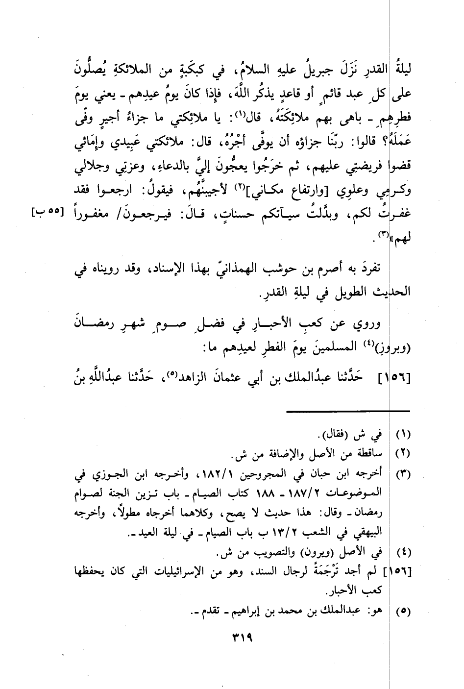 156 - حَدَّثَنَا عَبْدُ الْمَلِكِ بْنُ أَبِي عُثْمَانَ الزَّاهِدُ، حَدَّثَنَا عَبْدُ اللَّهِ بْنُ -[320]- مُحَمَّدٍ الْأَسْفَرَايِينِيُّ، حَدَّثَنَا إِبْرَاهِيمُ بْنُ مُحَمَّدٍ، حَدَّثَنَا عَبْدُ اللَّهِ بْنُ عَبْدِ اللَّهِ الْبَصِيرُ، حَدَّثَنَا عَبْدُ اللَّهِ بْنُ عَبْدِ الْوَهَّابِ، حَدَّثَنَا مُوسَى بْنُ سَعِيدٍ الرَّاسِبِيُّ، عَنْ هِلَالِ بْنِ عَبْدِ السَّلَامِ الْوَزَّانِ، عَنْ كَعْبِ الْأَحْبَارِ، قَالَ: §أَوْحَى اللَّهُ تَعَالَى إِلَى مُوسَى عَلَيْهِ السَّلَامُ " إِنِّي افْتَرَضْتُ عَلَى عِبَادِي الصِّيَامَ، وَهُوَ شَهْرُ رَمَضَانَ، يَا مُوسَى، مَنْ وَافَى الْقِيَامَةَ وَفِي صَحِيفَتِهِ عَشْرُ رَمُضَانَاتٍ فَهُوَ مِنَ الْأَبْدَالِ، وَمَنْ وَافَى الْقِيَامَةِ وَفِي صَحِيفَتِهِ عِشْرُونَ، فَهُوَ مِنَ الْمُخْبِتِينَ، وَمَنْ وَافَى الْقِيَامَةَ وَفِي صَحِيفَتِهِ ثَلَاثُونَ فَهُوَ مِنْ أَفْضَلِ الشُّهَدَاءِ عِنْدِي ثَوَابًا، يَا مُوسَى، إِنِّي آمُرُ حَمَلَةَ عَرْشِي إِذَا دَخَلَ شَهْرُ رَمَضَانَ أَنْ يُمْسِكُوا عَنِ الْعِبَادَةِ، فَكُلَّمَا دَعَا صَائِمُو رَمَضَانَ بِدَعْوَةٍ أَنْ يَقُولُوا: آمِينَ، وَإِنِّي أَوْجَبْتُ عَلَى نَفْسِي أَنْ لَا أَرُدَّ دَعْوَةَ صَائِمِي رَمَضَانَ، يَا مُوسَى، إِنِّي أُلْهِمُ فِي رَمَضَانَ السَّمَاوَاتِ وَالْأَرْضَ وَالْجِبَالَ وَالطَّيْرَ وَالدَّوَابَّ وَالْهَوَامَّ أَنْ يَسْتَغْفِرُوا لِصَائِمِي رَمَضَانَ، يَا مُوسَى اطْلُبْ ثَلَاثَةً مِمَّنْ يَصُومُ رَمَضَانَ فَصَلِّ مَعَهُمْ وَكُلْ وَاشْرَبْ مَعَهُمْ، فَإِنِّي لَا أُنْزِلُ عُقُوبَتِي وَلَا نِقْمَتِي فِي بُقْعَةٍ فِيهَا ثَلَاثَةٌ مِمَّنْ يَصُومُ رَمَضَانَ، يَا مُوسَى، إِنْ كُنْتَ مُسَافِرًا فَاقْدَمْ، وَإِنْ كُنْتَ مَرِيضًا فَمُرْهُمْ أَنْ يَحْمِلُوكَ، وَقُلْ لِلنِّسَاءِ الْحُيَّضِ وَالصِّبْيَانِ الصِّغَارِ أَنْ يَبْرُزُوا مَعَكَ حَيْثُ يَبْرُزُ صَائِمُو رَمَضَانَ، وَعِنْدَ تَصَرُّمِ رَمَضَانَ وَإِنِّي لَوْ أَذِنْتُ لِأَرْضِي وَسَمَائِي لَسَلَّمَتَا عَلَيْهِمْ وَلَكَلَّمَتَاهُمْ -[321]- وَبَشَّرَتَاهُمْ، بِمَا أُخْبِرُهُمْ، إِنِّي أَقُولَ لِعِبَادِي الَّذِينَ صَامُوا رَمَضَانَ: ارْجِعُوا إِلَى رِحَالِكُمْ فَقَدْ أَرْضَيْتُمُونِي، وَجَعَلْتُ ثَوَابَكُمْ مِنْ صِيَامِكُمْ أَنْ أَعْتِقَكُمْ مِنَ النَّارِ، وَأَنْ أُحَاسِبَكُمْ حِسَابًا يَسِيرًا، وَأَنْ أُقِيلَ الْعَثْرَةَ، وَأَنْ أُخْلِفَ لَكُمُ النَّفَقَةَ، وَإِنِّي لَا أَفْضَحُكُمْ بَيْنَ يَدَيْ أَحَدٍ، وَعِزَّتِي لَا تَسْأَلُونِي شَيْئًا بَعْدَ صِيَامِ رَمَضَانَ وَمَوْقِفِكُمْ هَذَا مِنْ آخِرَتِكُمْ إِلَّا أَعْطَيْتُكُمْ، وَلَا تَسْأَلُونِي شَيْئًا مِنْ أَمْرِ دُنْيَاكُمْ إِلَّا نَظَرْتُ لَكُمْ "