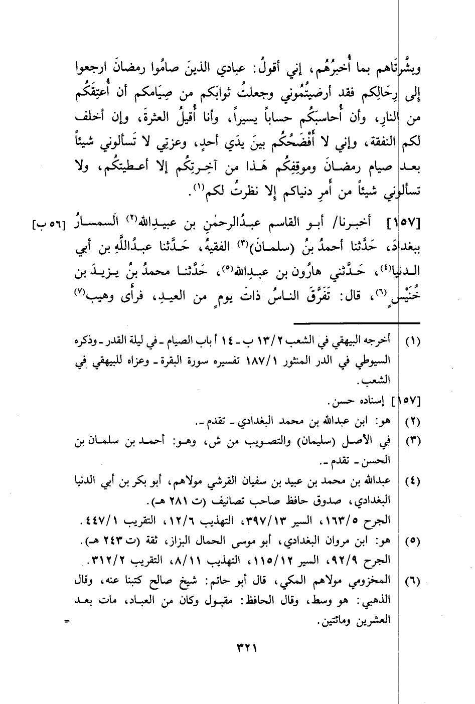 157 - أَخْبَرَنَا أَبُو الْقَاسِمِ عَبْدُ الرَّحْمَنِ بْنُ عُبَيْدِ اللَّهِ السِّمْسَارُ، بِبَغْدَادَ، حَدَّثَنَا أَحْمَدُ بْنُ سَلْمَانَ الْفَقِيهُ، حَدَّثَنَا عَبْدُ اللَّهِ بْنُ أَبِي الدُّنْيَا، حَدَّثَنِي هَارُونُ بْنُ عَبْدِ اللَّهِ، حَدَّثَنَا مُحَمَّدُ بْنُ يَزِيدَ بْنِ خُنَيْسٍ، قَالَ: تَفَرَّقَ النَّاسُ ذَاتَ يَوْمٍ مِنَ الْعِيدِ، فَرَأَى وُهَيْبٌ -[322]- يَعْنِي ابْنَ الْوَرْدِ النَّاسَ وَهُمْ يَمُرُّونَ بِهِ فِي ذَلِكَ الزِّيِّ فَنَظَرَ إِلَيْهِمْ سَاعَةً ثُمَّ قَالَ: §" عَفَا اللَّهُ عَنَّا وَعَنْكُمْ لَئِنْ كُنْتُمْ أَصْبَحْتُمْ مُسْتَيْقِنِينَ أَنَّ اللَّهَ عَزَّ وَجَلَّ قَدْ يَقْبَلُ مِنْكُمْ هَذَا الشَّهْرَ لَقَدْ كَانَ يَنْبَغِي لَكُمْ أَنْ تُصْبِحُوا مَشَاغِيلَ، عَمَّا أَنْتُمْ فِيهِ بِطَلَبِ الشُّكْرِ وَإِنْ كَانَتِ الْأُخْرَى خَائِفِينَ أَلَّا يَكُونَ تُقَبَّلَ مِنْكُمْ، لَقَدْ كَانَ يَنْبَغِي لَكُمْ أَنْ تَكُونُوا أَشْغَلَ قُلُوبًا عَمَّا أَنْتُمْ فِيهِ الْيَوْمَ